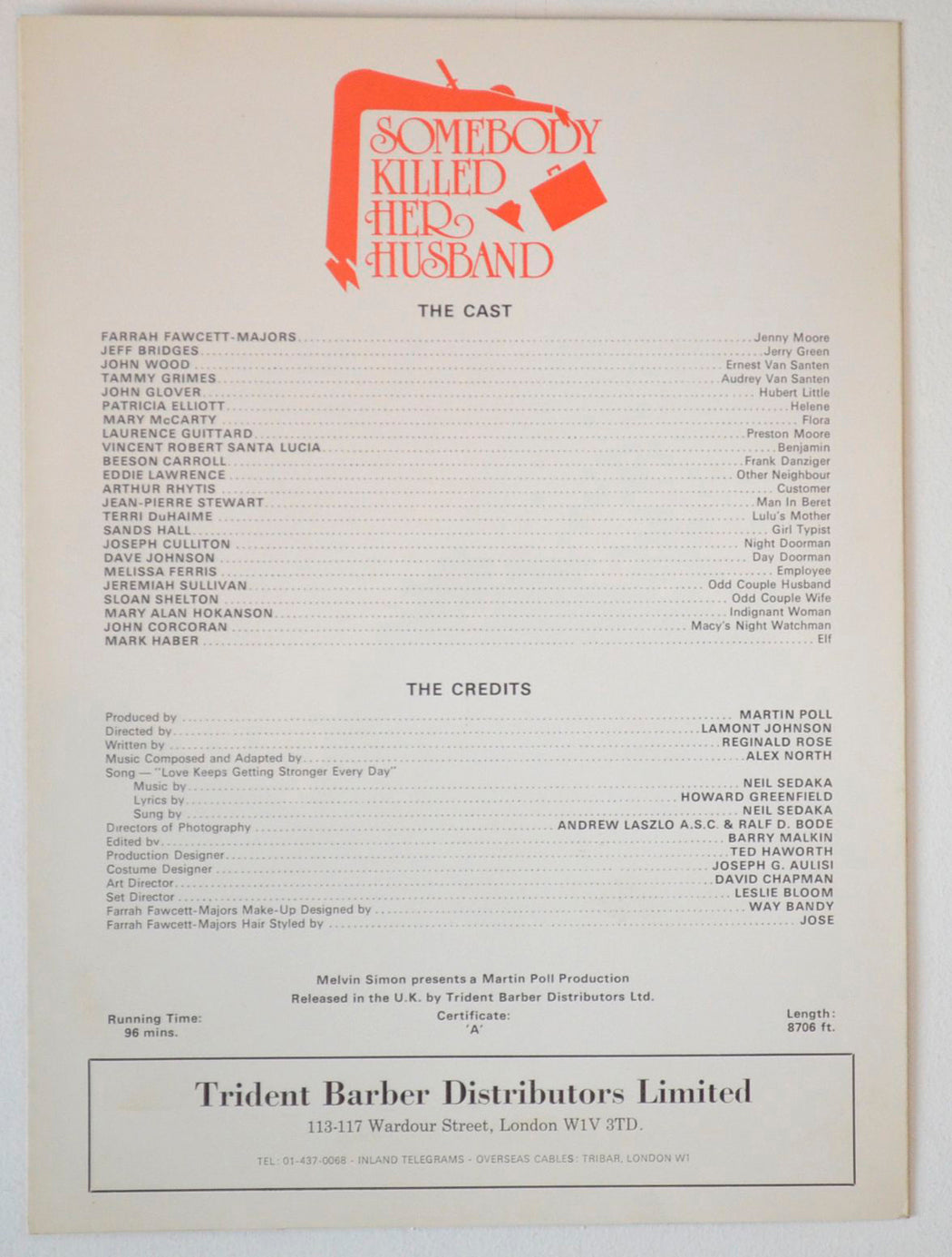 “Somebody Killed Her Husband” Original 6 Page Synopsis / Credits Foldout