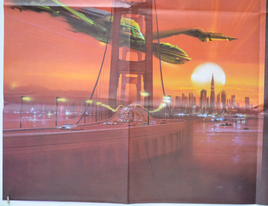Two extremely tiny tears on the top edge (right), extremely tiny tear near the top of the right edge, extremely mild creasing on the bottom edge (right), very light surface creasing around the top left corner area including a 9 cm diagonal crease above Shatner’s head, light surface creasing/wrinkles throughout the four fold segments around the title area and some within the four fold segments of the central area of the main artwork on the left, 10 cm diagonal crease from Nimoy’s lips down to the bridge, very light 12 cm diagonal crease from near the bottom of the left vertical fold line into the road area of the bridge, light creasing around some the fold intersections (note there are three horizontal and three vertical folds as issued), two tiny pinholes near the top of the left edge, otherwise very good!