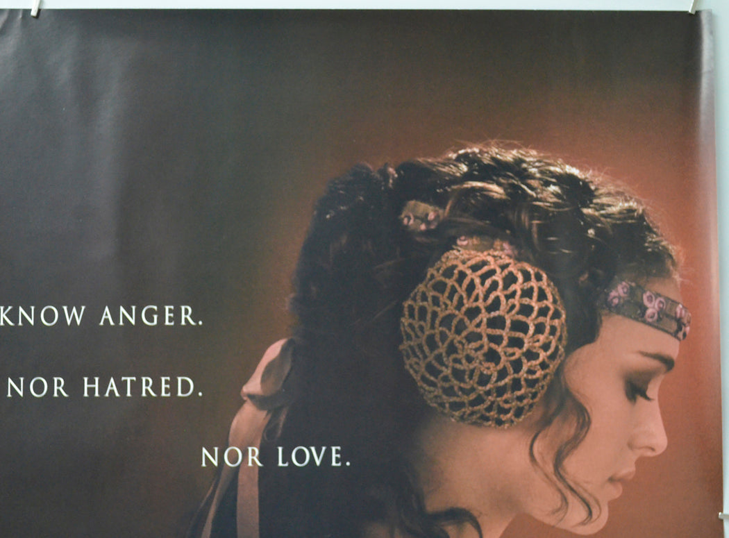 24 cm slightly diagonal light patchy print error line from Christensen’s eyebrow up to near the top left corner, 4 cm jagged surface crease and a slightly smaller crease to the left of Christensen’s chin/mouth area, tiny white surface crease just left of Christensen’s nose and another to the left of his eye, small white surface crease within the light of the lightsabre (near Chest area), extremely mild creasing on the top edge, very small tear and very mild creasing on the bottom edge, 1 cm, blu-tac grease ring? to the right of the R in STAR (within the bottom of Portman’s hair ribbon) this does go through to the back of the poster, light surface crease near the top of the right edge, 4 cm vertical crease/indentation line below the D in EPISODE, extremely faint 23 cm vertical crease/indentation line from the bottom edge up to Portman’s shoulder area, tiny white surface crease within the back of Christensen’s hair, otherwise very good.