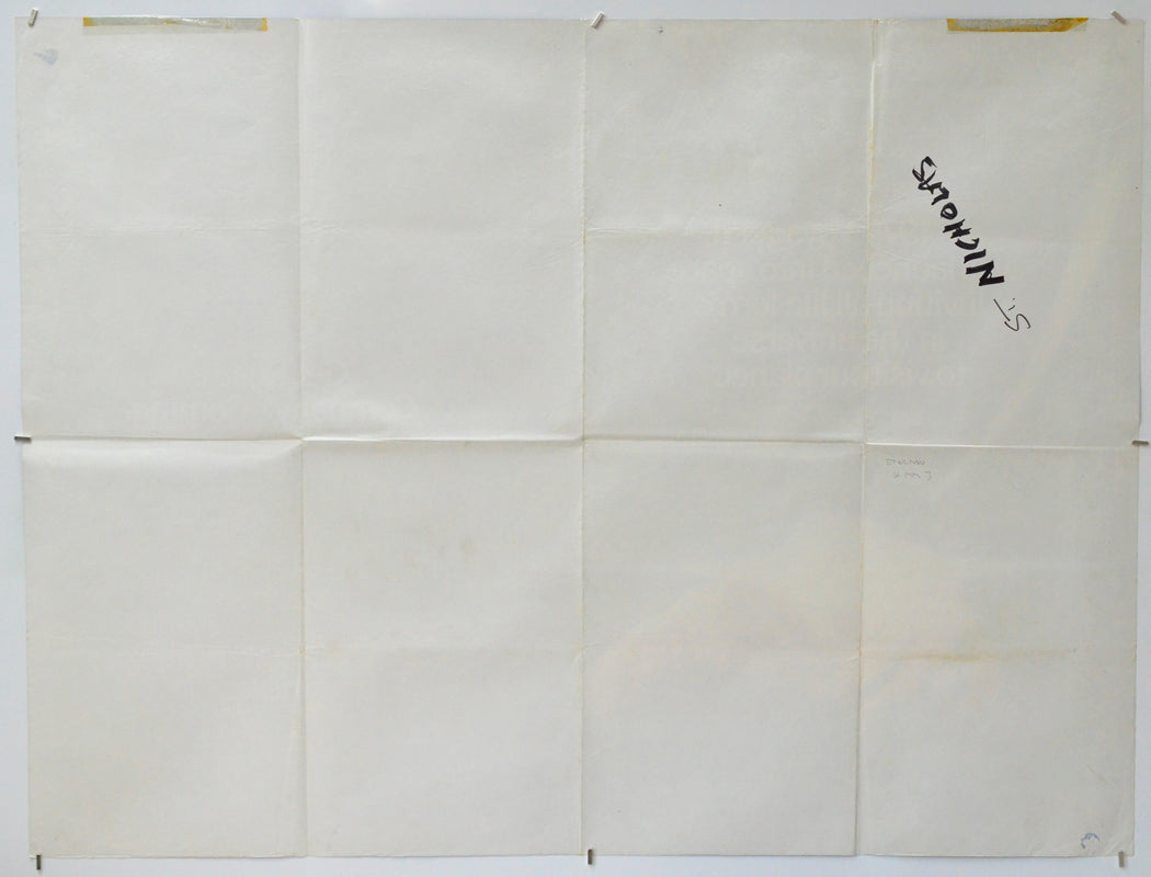 13 cm strip of Sellotape on the left of the top edge and a 17 cm strip on the right of the top edge, tiny tear on the top edge, 3 cm diagonal crease across the top right corner, two tiny tears and very mild creasing on the right edge, 2 cm diagonal crease and two smaller creases across the bottom right corner along with a very light 17 cm diagonal crease, approximately two tiny tears and mild creasing on the bottom edge, the surface is fairly creased/ wrinkled throughout (particularly near the side edges), 17 cm diagonal crease across the top left corner, 2 x 2 cm patch of surface paper loss on the back of the top right corner which is lightly visible on the front as it has created some paper thinning and creasing, fold wear (stress marks on the fold lines and creasing around the intersections plus a couple of the fold lines been folded slightly out of alignment and refolded) note there are three horizontal and three vertical folds, ST NICHOLAS has been written on the back in thick black marker pen (this is very lightly visible on the front even if the poster is backed, and it is very noticeable if held to light/backlit), blu-tac grease/residue on the back of every corner and slight Browning/Brown specks of damp (foxing) on the back of some of the fold lines (all only noticeable on the front if the poster is held up to the light / backlit), otherwise good.Double Sided :