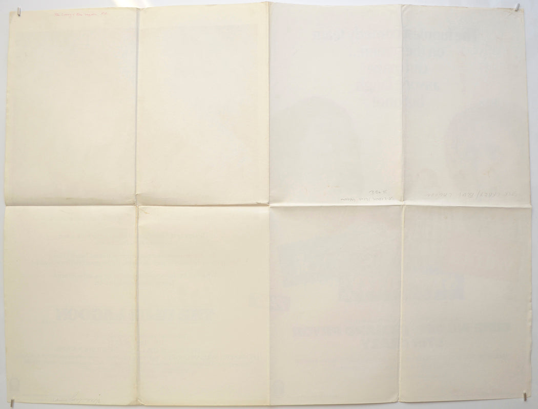Approximately four tiny tears and mild creasing on the top edge, small tear and very mild creasing on the right edge, extremely mild creasing on the bottom edge, approximately four tiny tears and very mild creasing on the left edge, 2 cm thin greyish mark near the bottom left corner (possibly linked liquid splash or print error?), Additional creasing around the left and right vertical fold lines due to being folded out of alignment and refolded (some dark print has transferred onto some of the creasing around the top half of the left vertical fold line), a few tiny dark print spots near both top corners, 5 cm diagonal crease and a smaller crease across the top left corner, light creasing around and between a couple of fold intersections, a few light surface wrinkles above the center horizontal fold line, title written on the back of the top edge in red Biro (only noticeable on the front if the poster is held up to the light / backlit), otherwise very good.