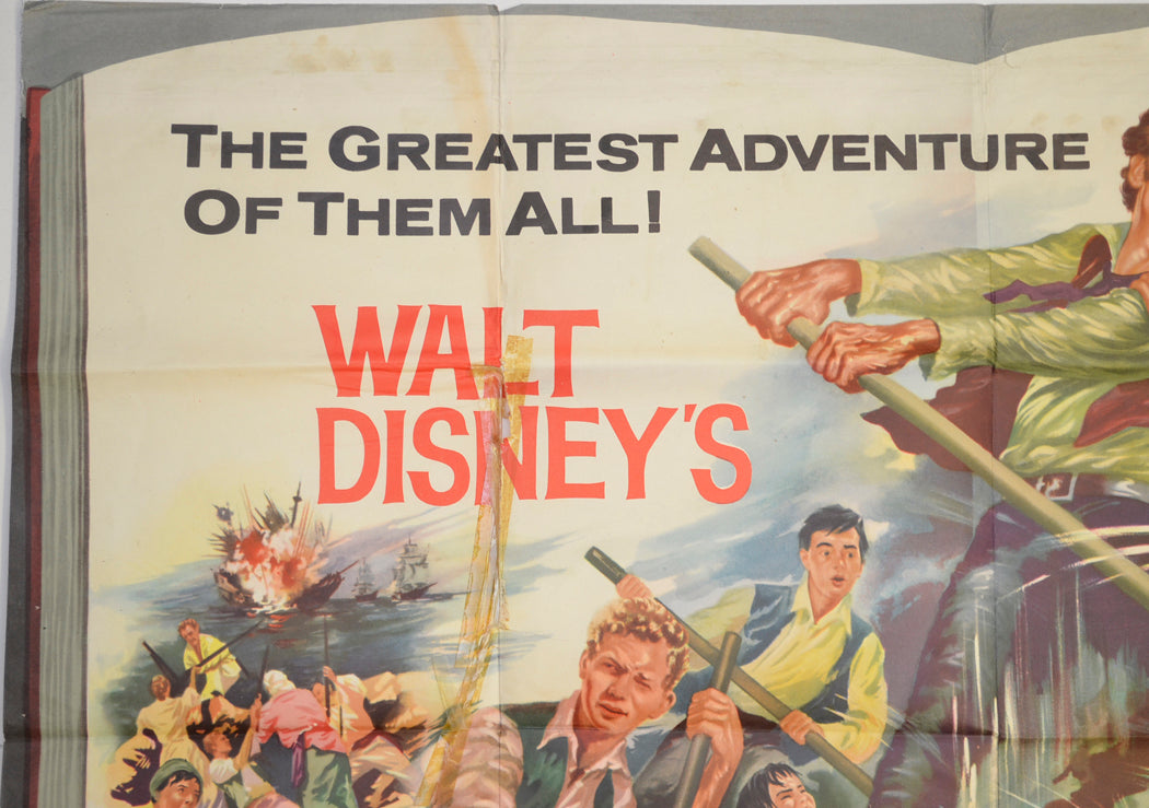 21 cm tear from the top fold intersection on the left vertical fold line down through the “Walt Disney” text into the boy’s arm beneath (there is a 25 x 2 cm Brown tape adhesive stain surrounding it), there is a faint reverse impression/staining of the previously mentioned tape adhesive stain just above it (from the top fold intersection on the left vertical fold line up to the top edge), there is also a faint reverse impression of the same stain on the opposite side of the poster (from the center fold intersection on the right vertical fold line up to the top edge (due to the two sides touching whilst stored folded for many years).