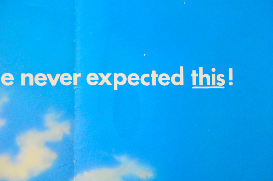 26 cm diagonal crease from the left of the moon up to the top edge, 6 x 3 cm oval slightly darker blue print error patch within and just below the PE in the EXPECTED text on the right, several tiny white/pinkish print error rings in the blue background in the top right corner fold segment (mostly above the EXPECTED text including a 3 cm fine patchy vertical line of tiny white print error dots), a few additional tiny white print error rings near the top half of the left edge and above the text on the left. 30 cm faint vertical crease and a 15 cm vertical crease through the left wrist area (the 15 cm crease has white stress marks on it and slight stress marks on the longer crease), extremely mild fold wear (light stress marks on some of the fold lines and light creasing around some of the intersections), three extremely tiny tears and extremely mild creasing on the top edge, 7 cm diagonal crease across the top right corner, 1 cm tear along with two tiny tears and extremely mild creasing on the bottom edge, 1 cm crease across the bottom left corner, 1 cm white horizontal surface crease and a couple of tiny white creases near the left edge, a couple of tiny white surface creases near the center of the right edge, light 6 cm horizontal crease just above the left shoulder, otherwise very good! Probably never displayed.Double Sided :