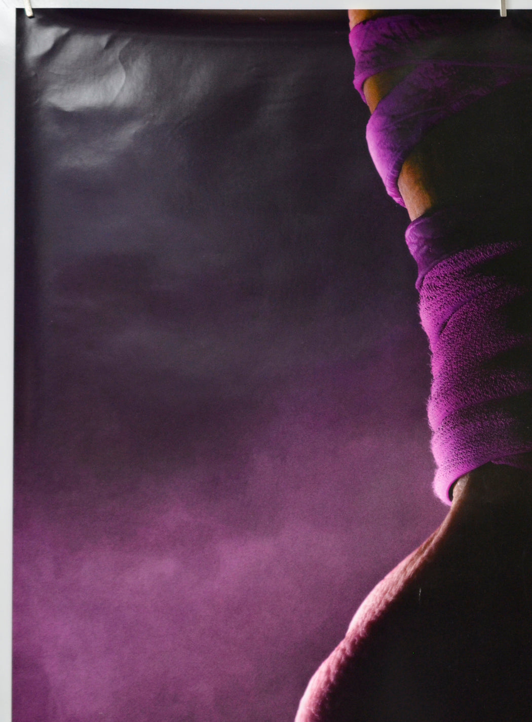 3 cm diagonal crease and a smaller crease across the top right corner, 1 cm tear and mild creasing at the top of the right edge, two tiny tears and a couple of tiny creases near the bottom of the right edge, tiny crease near the bottom of the left edge, approximately 3 tiny white surface creases in the light purple background below the staff, otherwise very good! Probably never displayed.
