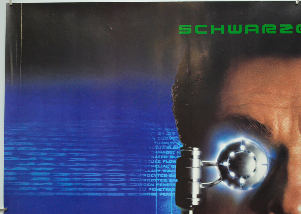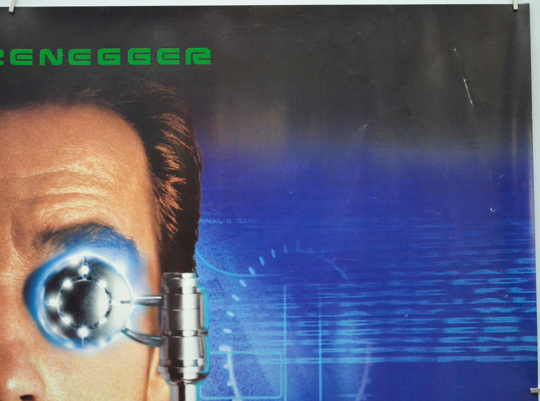 Two vertical light patchy print error lines from top to bottom near the left edge (one is more noticeable than the other), extremely faint vertical print error/ machine scuff line from top to bottom going down through the S in Schwarzenegger and through the left arm of the machinery, 26 cm diagonal crease across the top right corner area (has some white stress marks along it), some light scuffing also around the top right corner area, light scuffing and several white surface creases throughout the bottom right quarter of the poster including a 6 cm horizontal crease through the bottom of the circular digital display, a few tiny white surface creases near the left edge, otherwise okay.