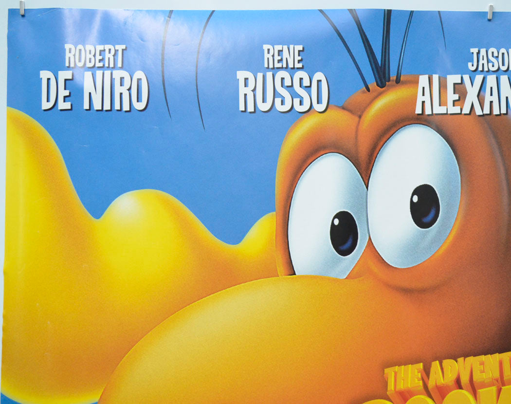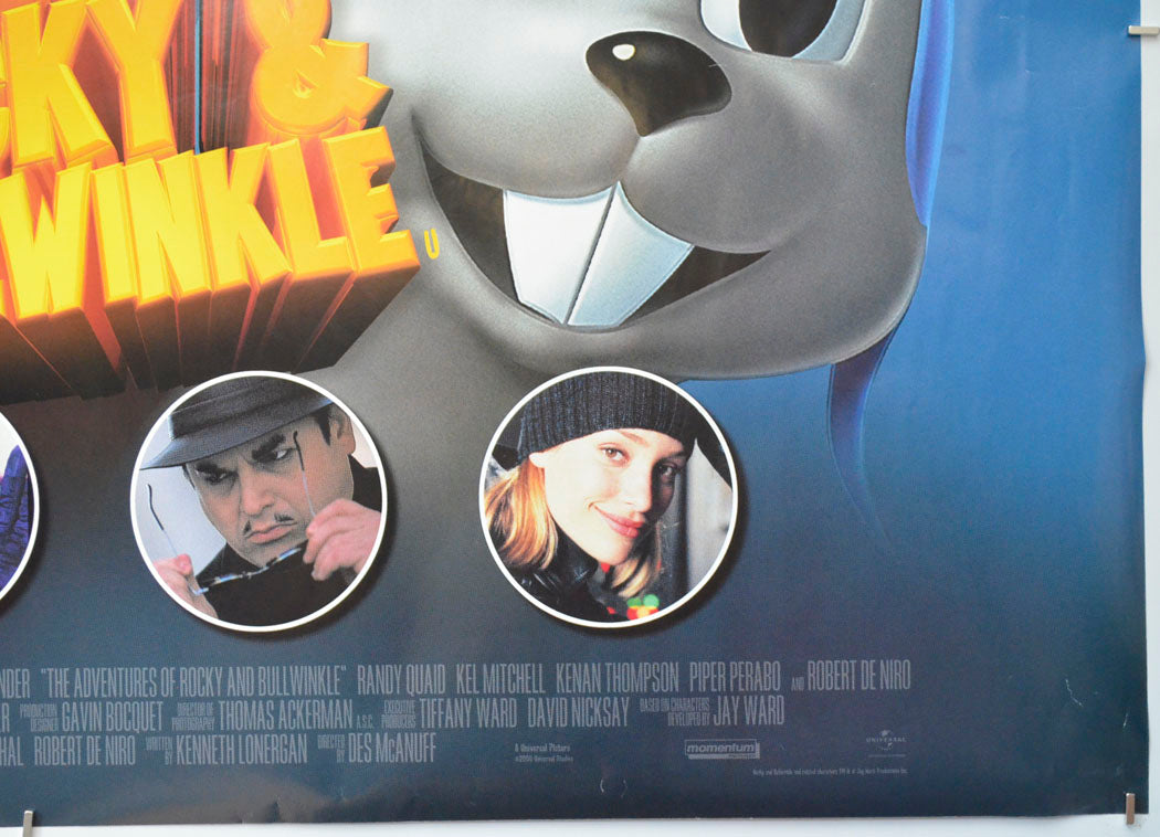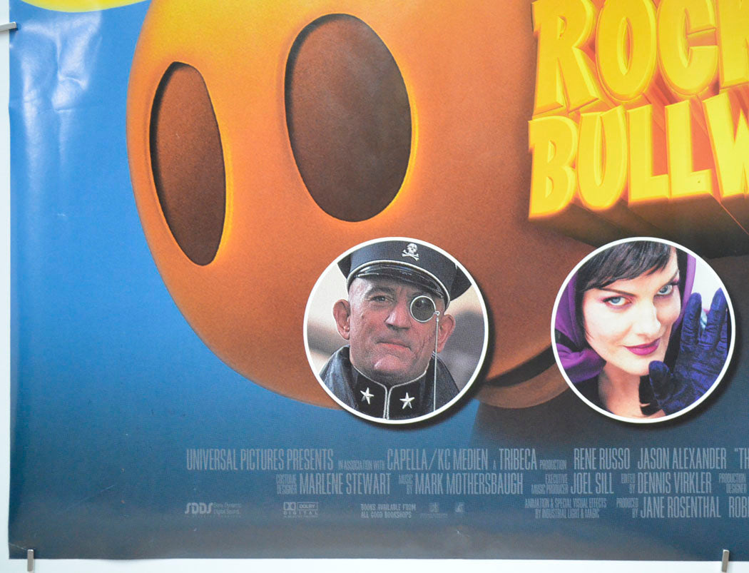 6 cm diagonal crease across the top left corner, extremely tiny tear and a couple of tiny creases on the top edge, 2 cm diagonal crease across the bottom left corner, some light surface creasing near the side edges including a couple of small white stress marks, 4 cm vertical fine patchy light print error line from the top edge down to the first R in ROBERT DE NIRO credit, a couple of tiny white surface creases below the ROBERT DE NIRO credit, tiny spot of residue within the bottom of the second L in BULLWINKLE title, some light surface creasing just above the bottom edge, small white surface crease on Rockets nose, otherwise very good.