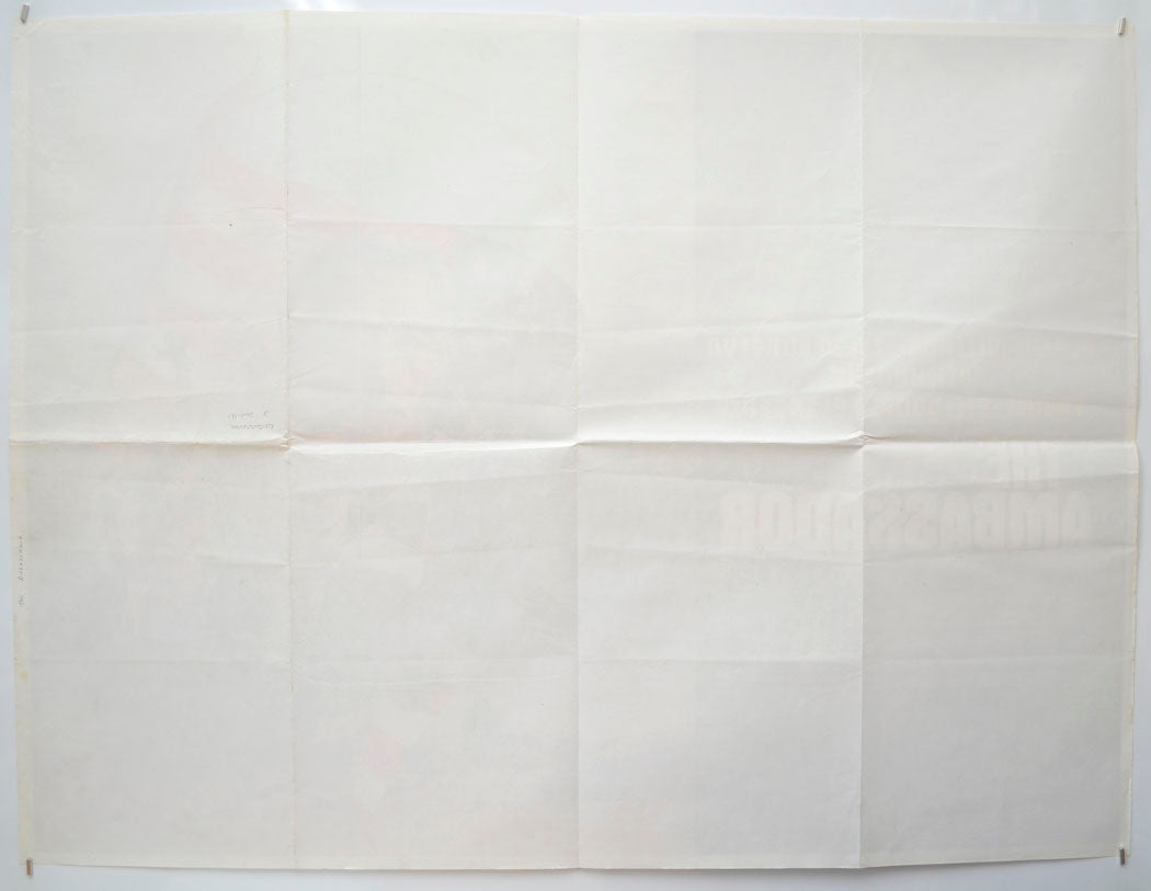 7 cm diagonal crease across the top left corner, small tear at the top of the left vertical fold line, 3 cm diagonal crease across the top right corner with a small tear at the right edge of it, tiny tear on the bottom edge, mild creasing and a couple of extremely tiny tears on the left edge along with slight Browning to the tip of the edge, very slight surface creasing near the edges, extremely mild fold wear (stress marks on some of the fold lines and additional creasing around some fold intersections) , additional horizontal fold line just above and below the AMBASSADOR title and two more additional folds around the top and bottom of the yellow credits (making a total of seven horizontal folds and three vertical folds), a couple of tiny black print dots in the top border, the title has been written on the back of the right edge in Biro and there is a tiny Brown stain dot on the back also (only noticeable on the front if the poster is held up to the light / backlit), otherwise very good!