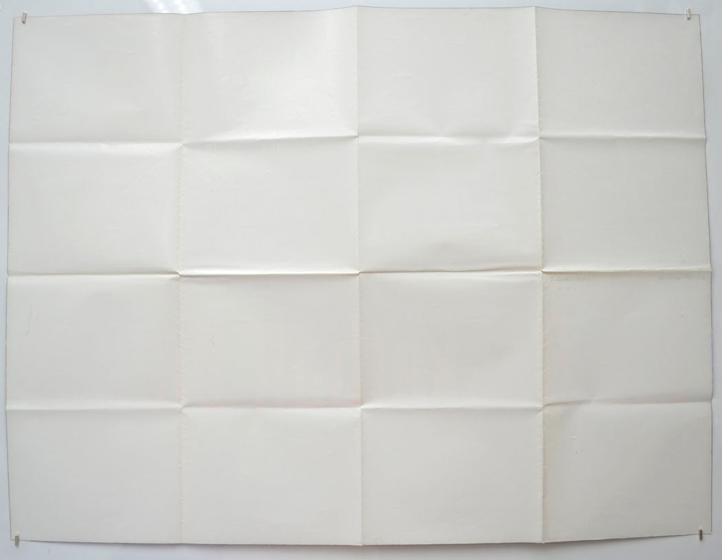 Extremely tiny tear and extremely mild creasing on the bottom edge, 4 cm fine light print error line with some additional faint lines around it near the top of the left edge, fold wear including white stress marks on the fold lines and a tiny tear at the center fold intersection on the left vertical fold line, some very light surface creasing, otherwise very good.
