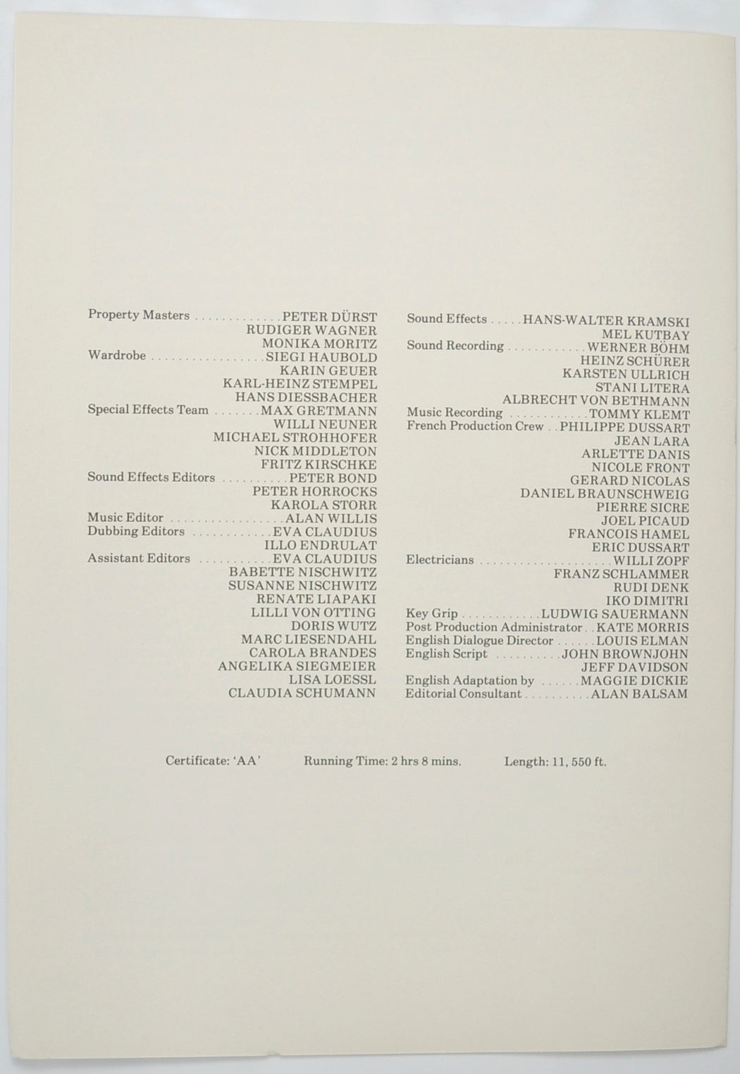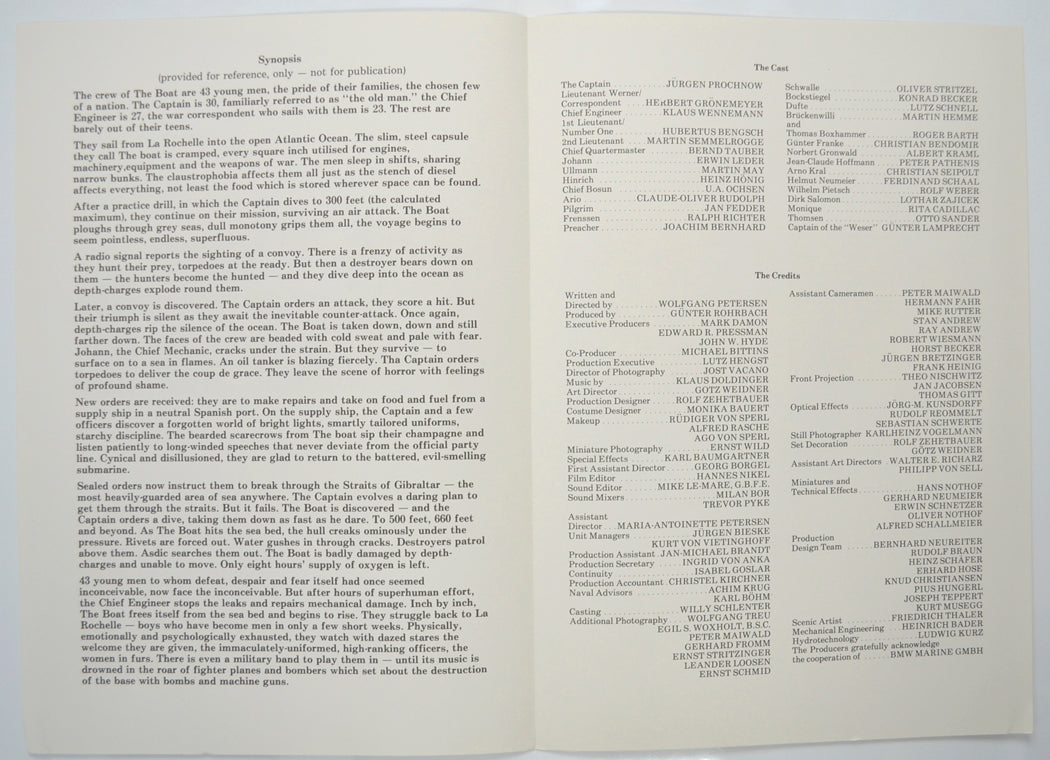 (a.k.a. Das Boot)Original Cinema Exhibitors Press Synopsis / Credits Booklet (UK)
