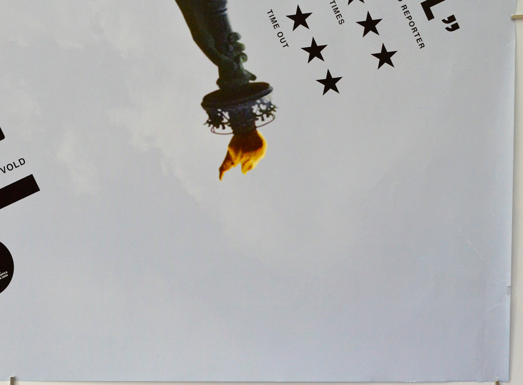 1.5 cm tear along with a couple of tiny tears and mild creasing on the top edge, 1 cm diagonal crease across the top right corner, two tiny tears with surrounding creasing near the bottom of the right edge, extremely tiny tear and extremely mild creasing on the bottom edge, two tiny tears near the bottom of the left edge, numerous small white surface creases throughout the first 3 inches (8 cm) of the left of the poster, 6 cm diagonal white crease and some additional light surface creasing near the bottom of the right edge, a little blu-tac grease/residue near every corner, otherwise good.Double Sided :