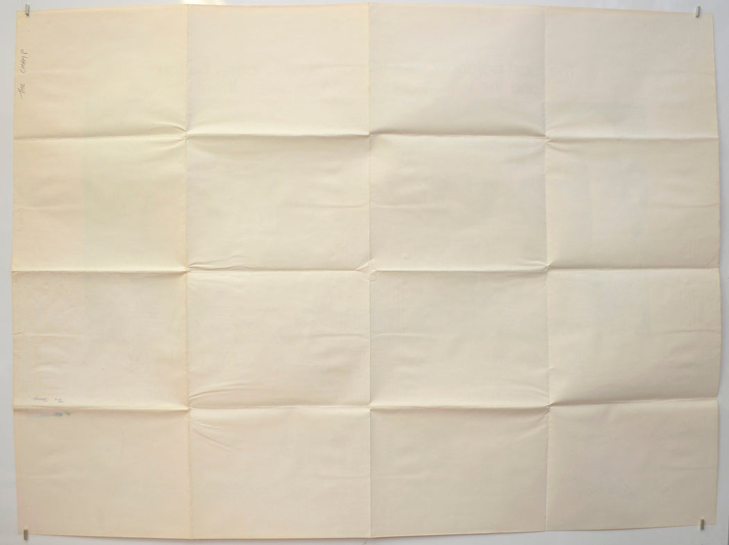 The poster must have become wet whilst stored folded as the surface especially around the edges is a little crisp and wavy, this has caused some slight discolouration on the front (mostly near the right edge with there is thick greenish smear just below the bottom horizontal fold line) and the orange background has turned a little greenish below and above the main picture near both side edges, 1 cm tear on the right edge, extremely mild edge wear on the left edge, light surface creasing around some of the fold intersections (note there are three horizontal and three vertical folds as issued), title written on the back of the right edge in Biro (this is lightly visible on the front more so if the poster is held to light/backlit), otherwise good.