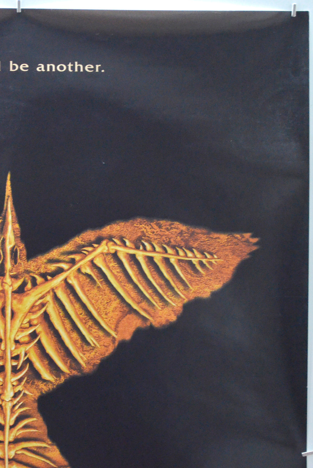 Mild creasing on the left edge including four 4 cm diagonal white stress lines near the bottom and some small stress lines near the top, a couple of tiny creases on the right edge, the black background is a little light and patchy near the side edges (possibly caused by light machine scuffing), faint horizontal band of scuffing across the poster (just below the tag line at the top), a couple of small surface creases above the tag line at the top, a few random light scuff lines here and there along with a few tiny surface creases, otherwise good. (Note this is the single sided version).