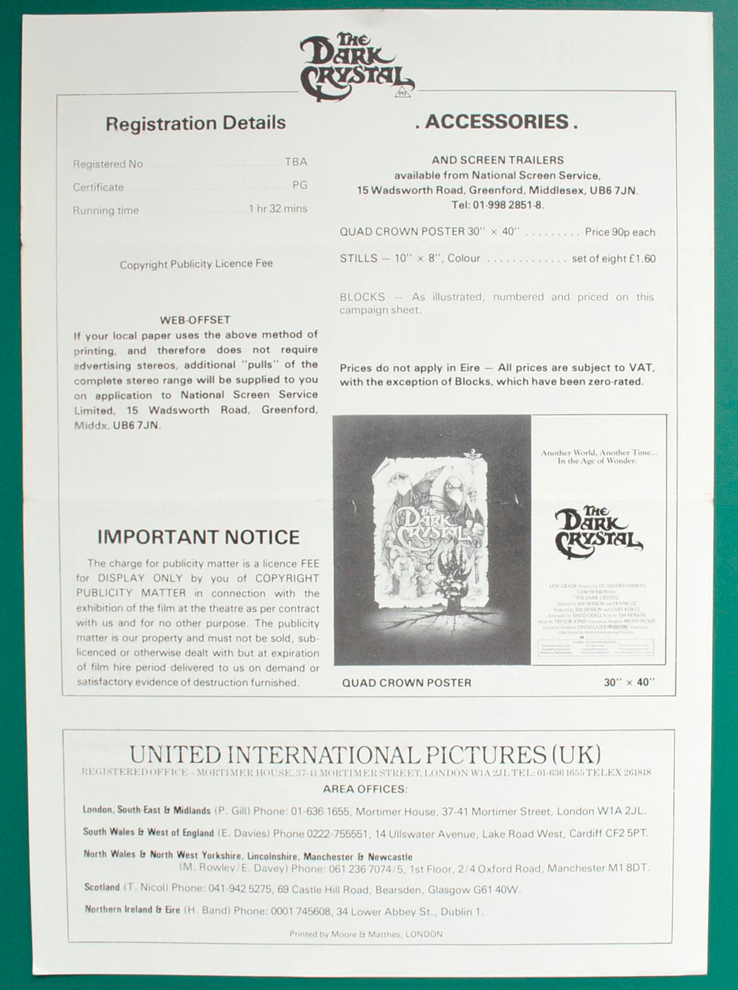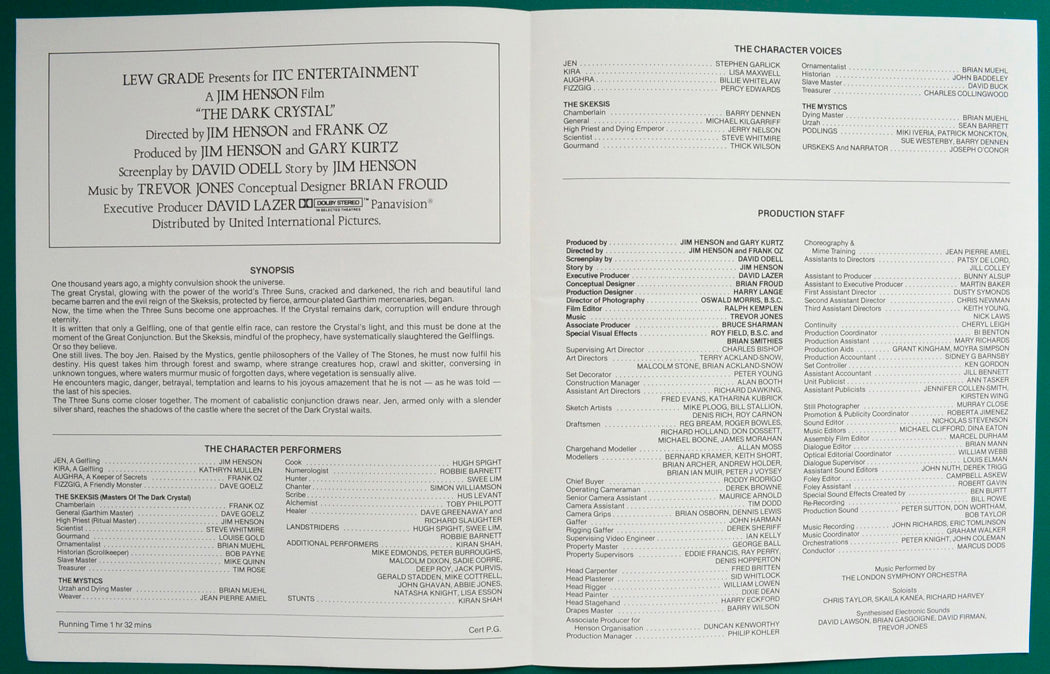 “The Dark Crystal” Original 4 Page Cinema Exhibitors Synopsis / Credits Booklet + Accessories / Advertising Blocks Sheet + Synopsis Sheet