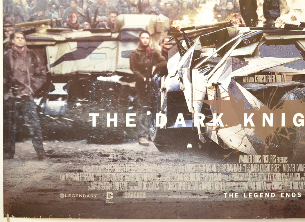 4 cm diagonal crease across the top left corner, tiny tear and mild creasing on the top edge including a few white stress lines, tiny crease on the tip of the top right corner, tiny tear and mild creasing on the bottom edge including several white stress lines, 8 cm diagonal crease from the bottom right corner upwards (has several white stress marks along it, small crease across the bottom right corner, band of approximately sixteen 1 cm white surface crease marks evenly spaced across the poster (going through Bane’s waist & thigh level), a few tiny white surface creases near the side edges, faint crease from the top edge down to the soldier to the right of the Batmobile, some very light vertical roll waves throughout (only really noticeable at certain viewing angles), otherwise good.