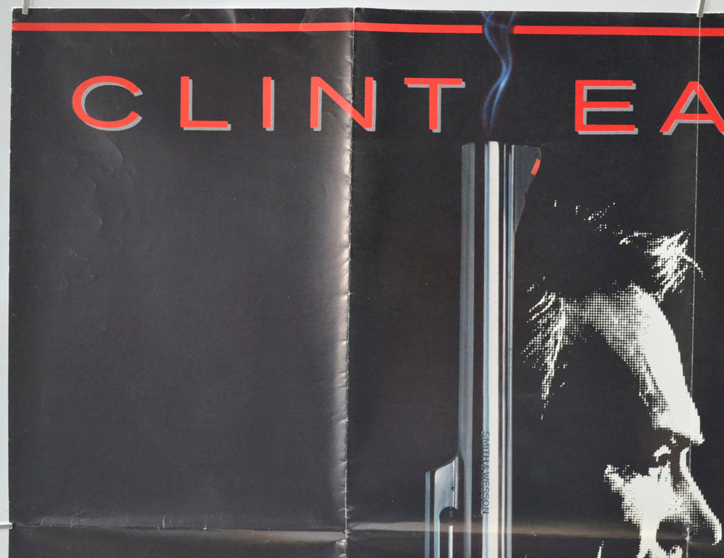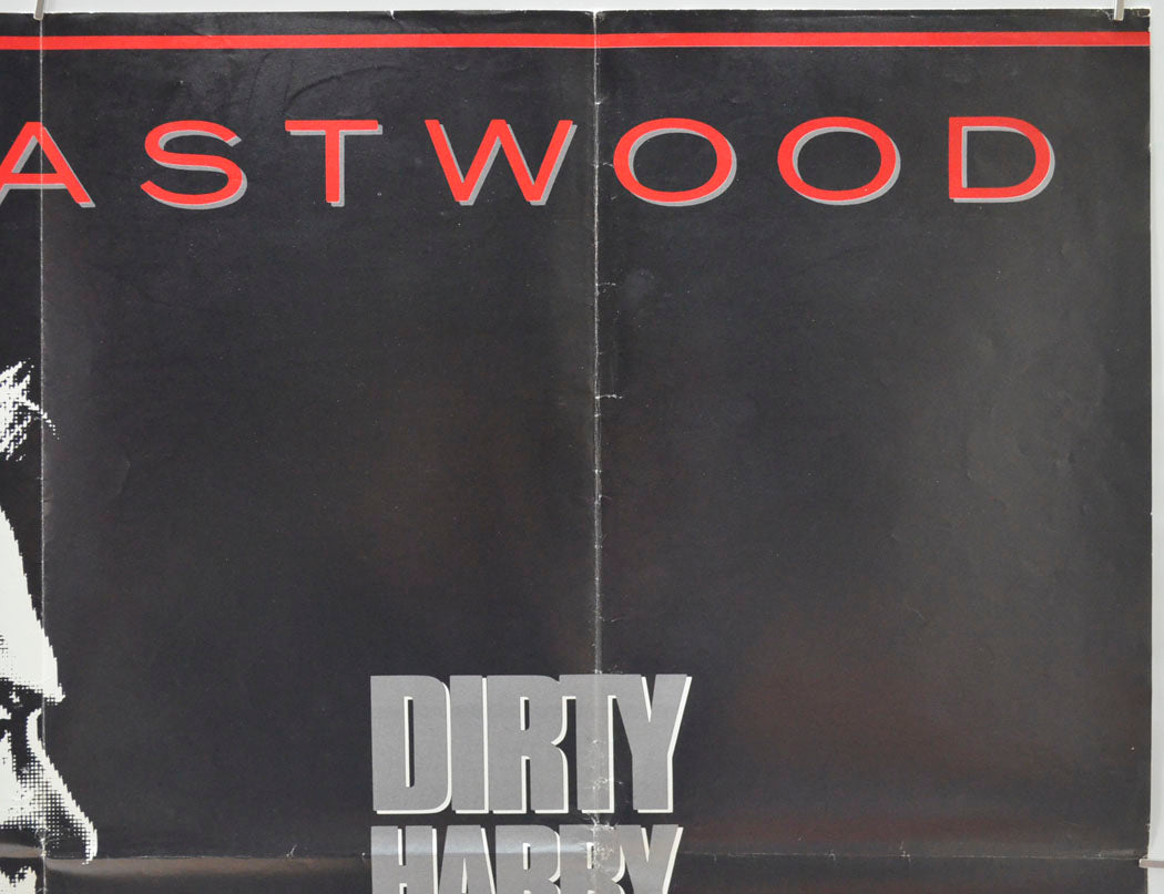 Tiny tear and very mild creasing on the top edge, light creasing to the corner tips, very mild creasing/edge wear on the right edge, four small tears and mild creasing on the bottom edge (largest tear is 1 cm), extremely mild creasing/edge wear on the left edge, some light scuff patches in the black background below and to the left of the handle of the gun, light surface creasing around the top and bottom edges including a few small white stress marks, some additional light surface creases/wrinkles throughout, mild fold wear (white stress marks on the fold lines and additional creasing around the right vertical fold), the title has been written on the back of the top edge in blue Biro and the back of the right half of the center horizontal fold as yellowed slightly (only noticeable on the front if the poster is held up to the light / backlit), small patch of white vertical crease lines just right of the center vertical fold line (a couple of inches below Eastwood’s chin), otherwise good.