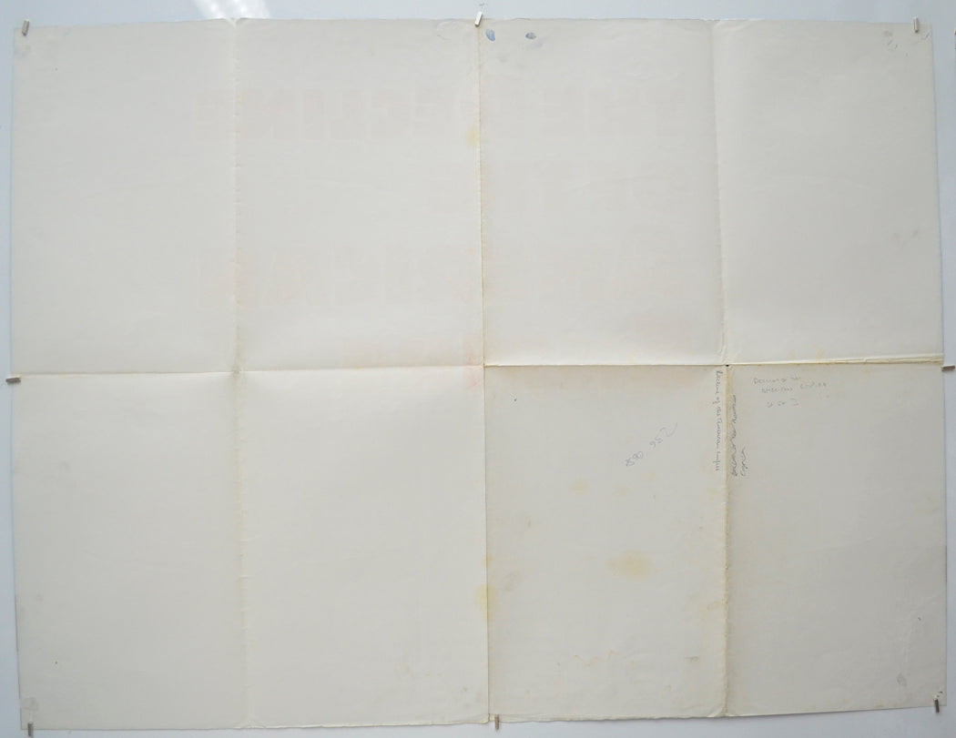 Extremely faint 50 x 7 cm water stain on the back of the bottom edge and there are a few light yellowish grease stains on the back also, along with some blu-tac grease/residue on the back of the corners and back of the center of the top and bottom edges, plus a small spot of surface paper loss on the back of the corners and top center due to blu-tac removal (all of the flaws on the back are only noticeable on the front if the poster is held to light/backlit). Approximately three tiny tears and very mild creasing on the top edge, 1 cm tear along with approximately 4 tiny tears and mild creasing/edge wear on the bottom edge, tiny tear at the center of the left edge, mild fold wear including a small wear hole at the left fold intersection and a couple of tiny separations through the bottom half of the left vertical fold line and the left of the center horizontal fold, light surface creasing around the top and bottom edges, otherwise good.
