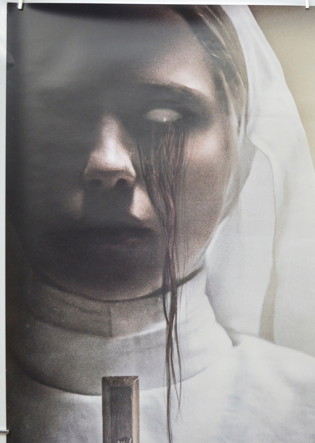 Small thick crease near the bottom of the right edge, extremely mild creasing at the top of the left edge, vertical band of light surface creasing from just above the top center of the title down to the bottom edge (including some tiny white stress marks), very light horizontal crease from just right of the nun’s eye across to the center of the poster, otherwise very good.