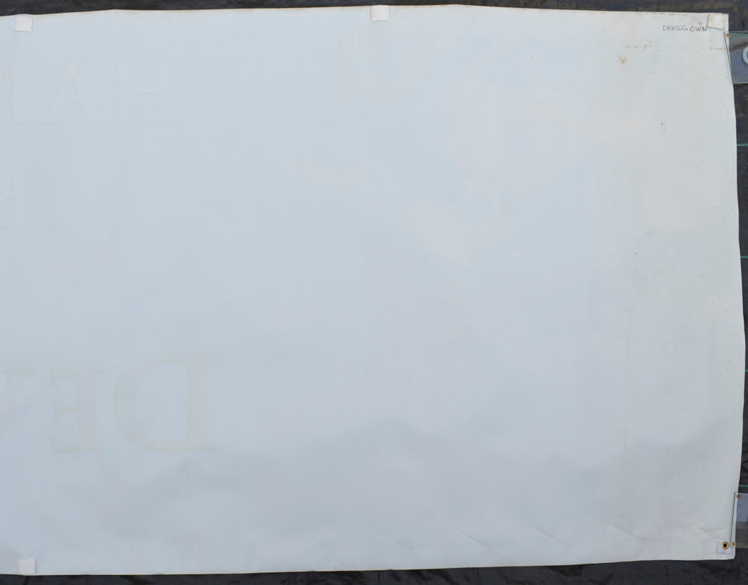 Light creasing from a rubber band just above the bottom edge and also around the top left corner (due to the rubber band being around the banner whilst stored rolled for many years) this should drop out over time, Velcro pads on the back of the banner, the title has been written on the back of the top left corner in Biro, a few light specks of damp around the right edge (should wash off with a light detergent solution), a few small specks of dirt on the back of the left edge (again should wash off with a light detergent solution), otherwise very good.