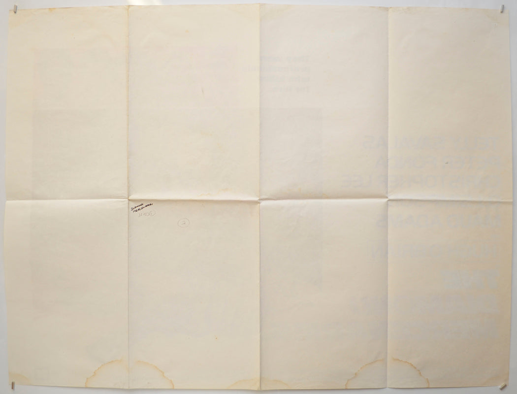18 x 6 cm light Brown liquid stain at the bottom of both the left and right vertical fold lines and a 13 x 3 cm light Brown liquid stain at the center of the bottom edge, 6 x 3 cm light Brown liquid stain on both bottom corners, numerous light vertical scuff lines from just below Savalas’s hand down to the bottom edge, extremely tiny tear on the top edge, a few faint Brown spots of damp around the edges (a couple of darker patches on the top edge), two additional vertical fold lines/creases on the right of the poster (going through the Jeep and tail of the helicopter), approximately four pinholes near both top corners, two pinholes near both bottom corners (these are a few inches inward of the edges), pinhole just below the trigger of the gun, pinhole a few inches down from the top of the left vertical fold line, there are a couple rust marks and fingermarks around some of the previously mentioned pinholes, 2 x 1 cm faint Brown liquid stain on the center horizontal fold line (in the white background just left of the main picture), title written on the back in black pen (only noticeable on the front if the poster is held up to the light / backlit), very faint 10 x 4 cm liquid stain on the back of the center horizontal fold line (again only noticeable on front if held to light/backlit), whole poster has very slightly browned with age, otherwise good.