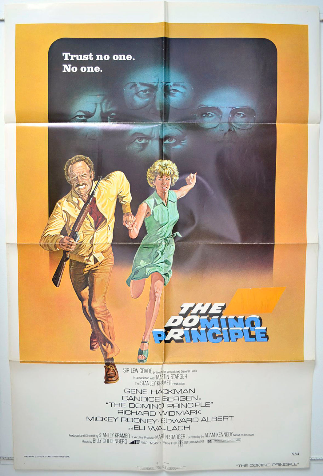 11x7 cm Yellow Sticker placed over the text "The Stanley Kramer Production" by the distributor just above the "INO" in the title, A few tiny yellow spots down the left edge (possibly damp), faint yellowing along some of the fold lines, some fold wear (stress marks on the fold lines), small dirty mark just left of Hackman's right shoe, Otherwise Good!