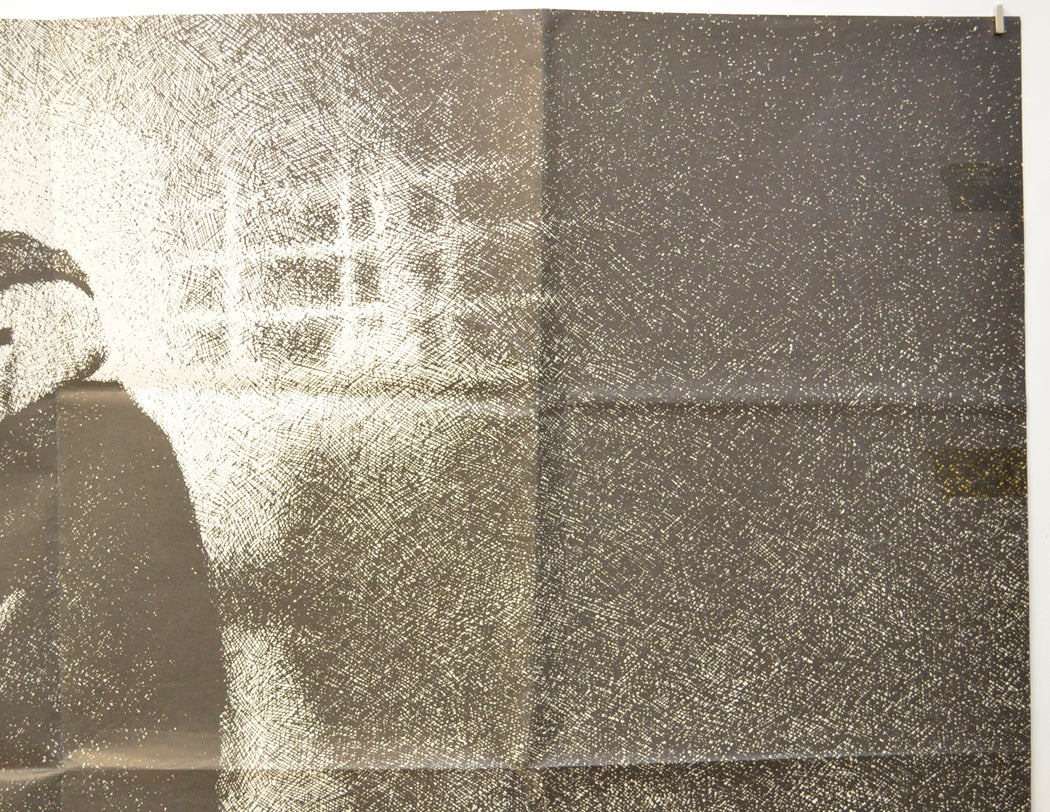 2 cm tear along with approximately 8 smaller tears and moderate creasing on the left edge (mostly the bottom half), light creasing to the corner tips, five patches of tape adhesive staining on the left edge and four patches on the right edge plus one patch on the bottom edge (the tape adhesive has discoloured the paper in all areas and the largest patch is 6 x 4 cm), very mild fold wear (light creasing around some the fold intersections), additional vertical fold next to both the main left and right vertical folds (making a total of five vertical and three horizontal fold lines), light slightly diagonal crease from top to bottom (from just right of the top center down through the M in MAN), title written on the back a couple times black Biro (only noticeable on the front if the poster is held up to the light / backlit), otherwise very good.