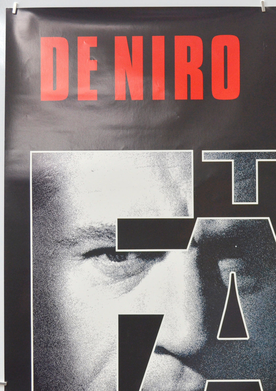 9 cm diagonal crease across the bottom left corner, extremely mild creasing on the right edge, the black print near the top of the right edge is a little light and patchy in places, 3 cm light surface crease in the black background to the left of the FEAR text, a couple of light surface creases within and below the DE NIRO credit at the top, otherwise very good.