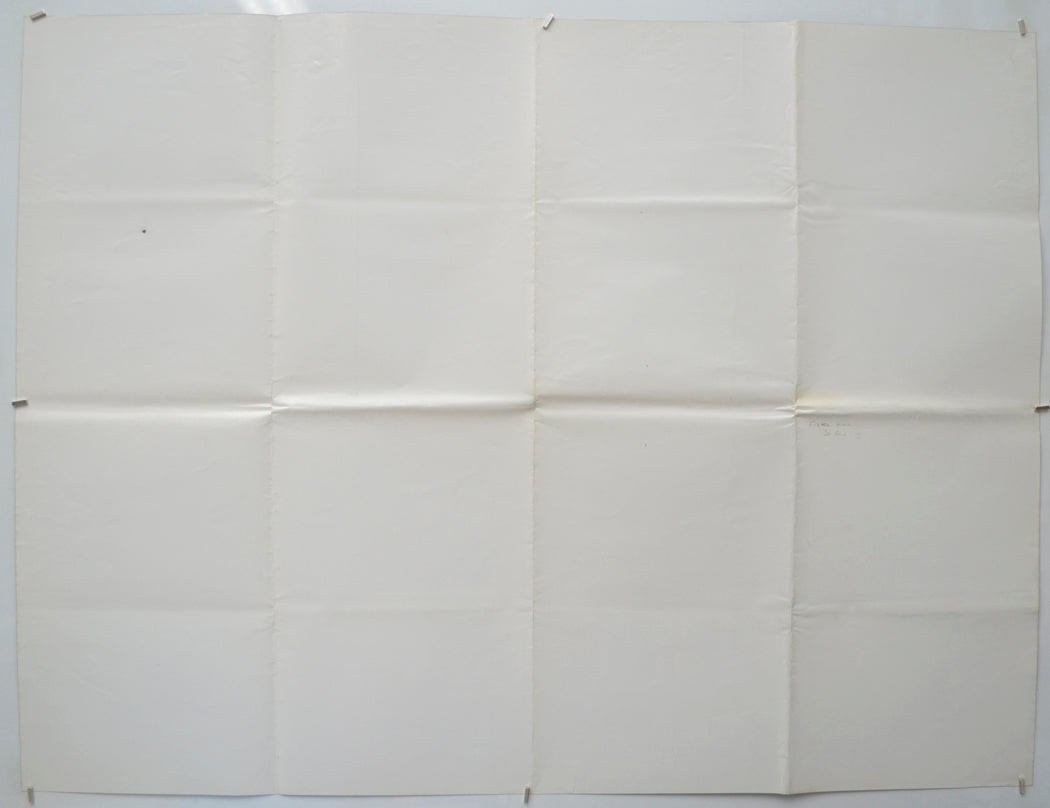 2 x 2 cm patch of tape adhesive staining with a couple small spots of print loss within it within the top red half of the central building, 2 x 2 cm area of patchy tape adhesive staining in the grey background below the right quarter of the top horizontal fold line (there may be a tiny speck of print loss at the center of it as it is translucent when held to light), extremely mild creasing on the side edges, a couple of small creases on the bottom edge, some very light surface creasing around the edges including a few tiny white stress marks near the bottom right corner, a few tiny dark print spots also in this area, 3 cm fine light vertical print error through the bottom of the H in FISHER with a few much fainter and finer print error lines around it, mild fold wear including white stress marks on some of the fold lines and additional creasing around some of the intersections, slight Browning to the back of the left quarter of the center horizontal fold line (only noticeable on the front if the poster is held up to the light / backlit), otherwise good.