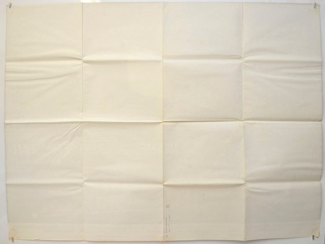Large piece of Sellotape on every corner and the center of every edge (the adhesive will have stained the paper beneath), two additional patches of Sellotape near the left edge (above the center horizontal fold line), small tear and very mild creasing on the bottom edge, 1 to 2 pinholes near every corner and the center of every edge, creasing around some the fold intersections (note there three horizontal and three vertical folds as issued), a little dark print has transferred into the bottom white border, the title and date have been written on the back in Biro (only noticeable on the front if the poster is held up to the light / backlit), slight Browning to the back of the left vertical fold line (again noticeable on front if backlit), otherwise good.