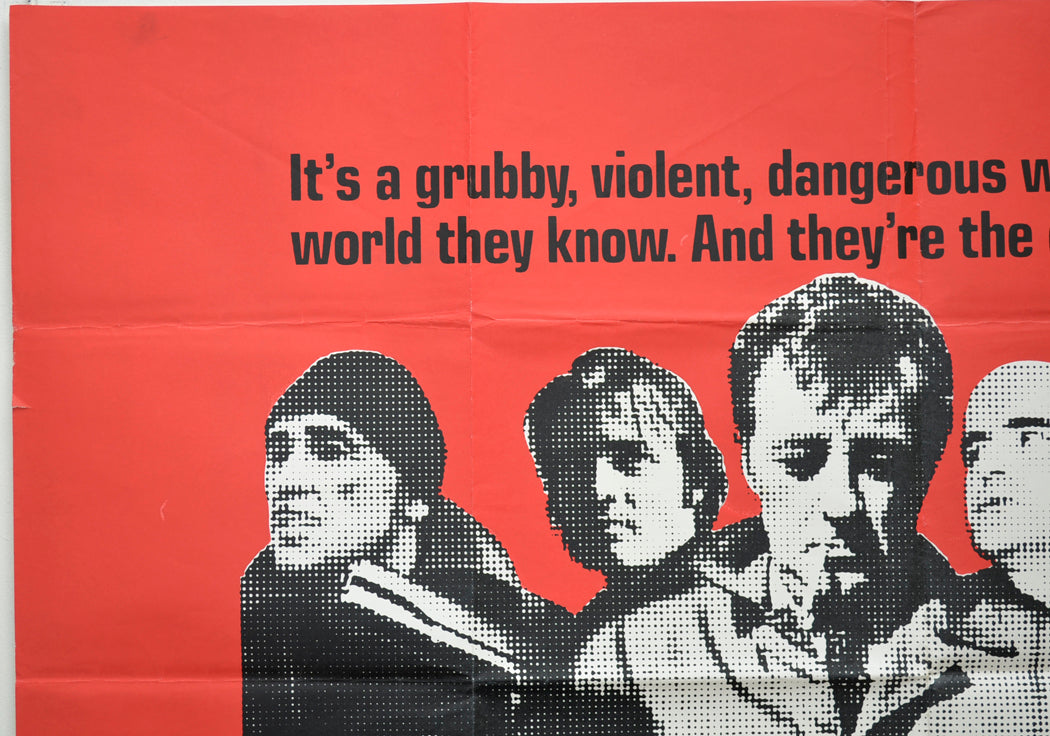20 cm jagged tear from the bottom edge up to just below the bottom left corner of the main image (repairable) , two tiny tears and mild edge wear also on the bottom edge, two 1 cm tears and a tiny tear on the right edge along with mild creasing, tiny crease across the tip of top corners, 1 cm tear and an extremely tiny tear on the left edge along with mild edge wear, 2 x 1 cm light patch in the red background on the top edge.. print error? (a few inches right of center), small light patch in the red background a few inches left of the man furthest left’s head. (again probable print error), Some light diagonal streaks in the red background between the edge of the main image and the right edge plus some random very light streaks elsewhere (print error), additional vertical fold line just left of center, mild fold wear including a small wear hole at the center and right fold intersections on the center horizontal fold line, small dark patch in the red background near the top left corner, light diagonal crease line zigzagging between the top edge and the fold intersections along the top horizontal fold line), title written on the back along with a date in Biro and the back of a couple of the fold lines have browned slightly (only noticeable on the front if the poster is held up to the light / backlit), otherwise very good.