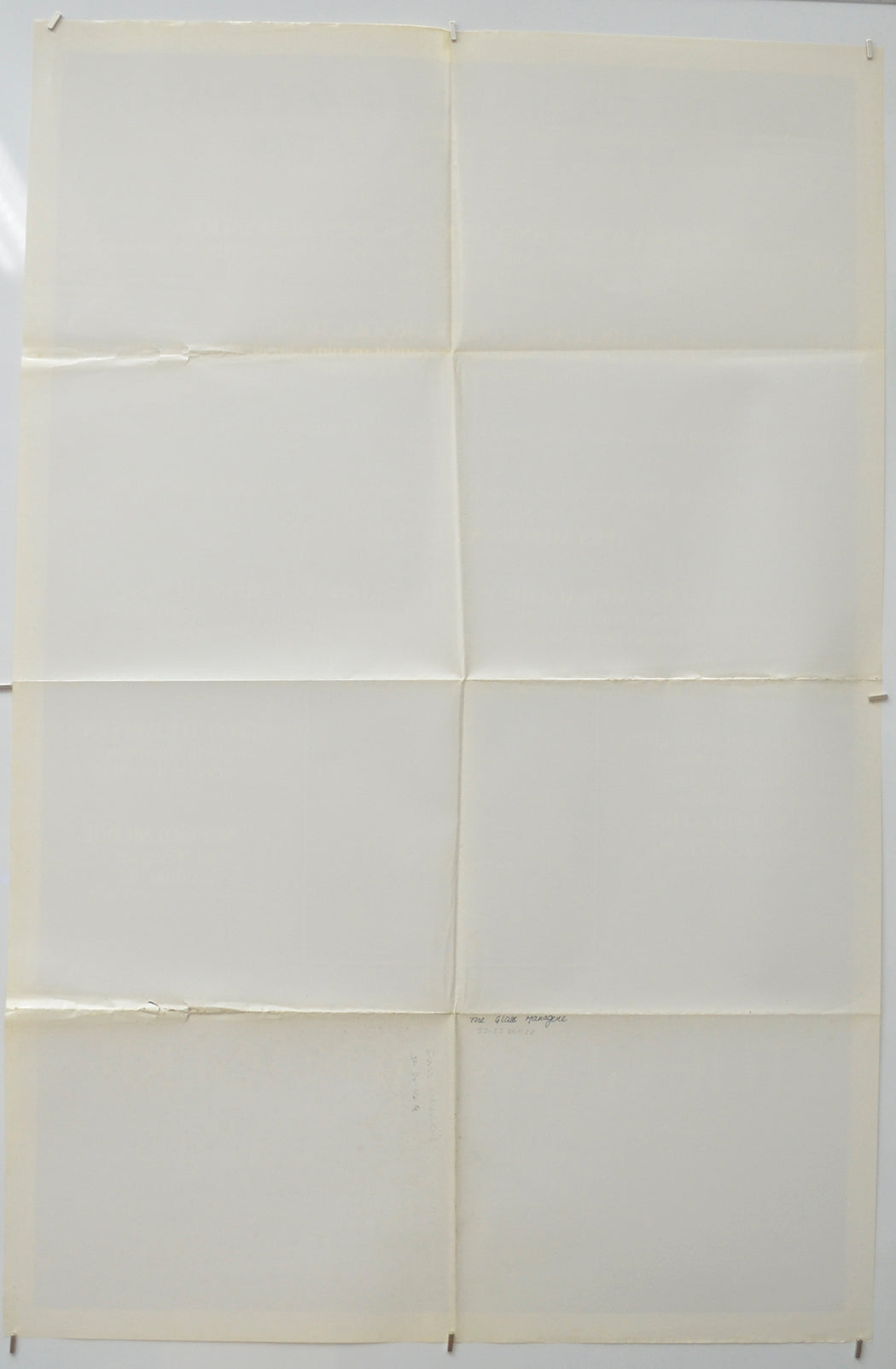 Tiny crease across the top left corner, very mild edge wear on the top edge, two tiny tears and mild creasing on the right edge, fold wear including several small tears across the bottom horizontal fold line and two 2 cm tears across the top horizontal fold line (all on the right) along with creasing and white stress marks on all folds, 2-6 pinholes near each corner, some light surface creasing here and there, Browning/light Brown specks of damp (foxing) on the back of the bottom horizontal fold line and some additional faint dull patches of damp throughout the back of the bottom right corner fold segment (only noticeable on the front if the poster is held up to the light / backlit), the title has been written on the back in black pen (again only noticeable if backlit), otherwise good.