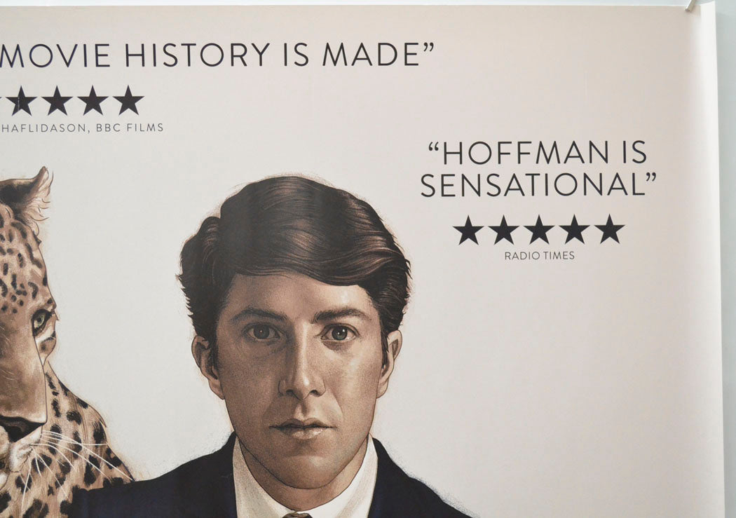 Tiny crease across the tip of the top left corner, a couple of extremely tiny creases on the top edge, extremely mild creasing along the tip of the bottom edge, 1 cm white surface crease on Hoffman’s right shoulder, 2 cm white surface crease on the left edge (just below the top leaf), 4 cm white vertical crease above the review near the top right corner and another above Hoffman’s head, 3 cm white vertical crease through the second star in the review at the top center, 3 cm faint vertical crease just below the ACHINGLY text at the top, otherwise excellent!