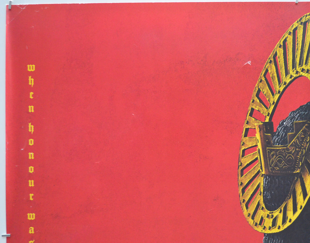 5 cm diagonal white crease and additional creasing around the top left corner, extremely mild edge wear on the top edge, mild edge wear/creasing on the bottom edge including some small spots of print loss, horizontal band of approximately 12 small white surface creases across the poster (going through the first word of the title level), some additional small white surface creases near both side edges, 1 cm thick white surface crease in the red background near the top center, a couple of additional small white surface creases within the head of the King, 4 cm vertical white crease line near the bottom center along with a couple of smaller creases, a little blu-tac grease/residue near the bottom right corner, otherwise okay.