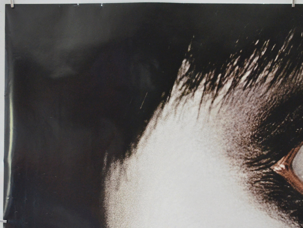 Two small tears on the top edge, several small white surface creases within the first 4 inches (10 cm) of the left of the poster (mostly in the black hair area above the ear), small white surface crease within the black pupil of the eye (left of the 2), 3 cm white surface crease in the black of the bottom eyelid, otherwise very good!