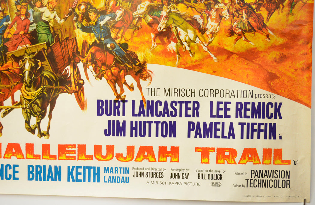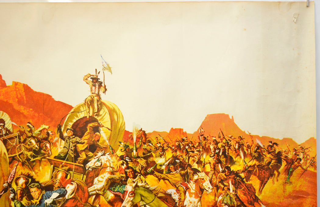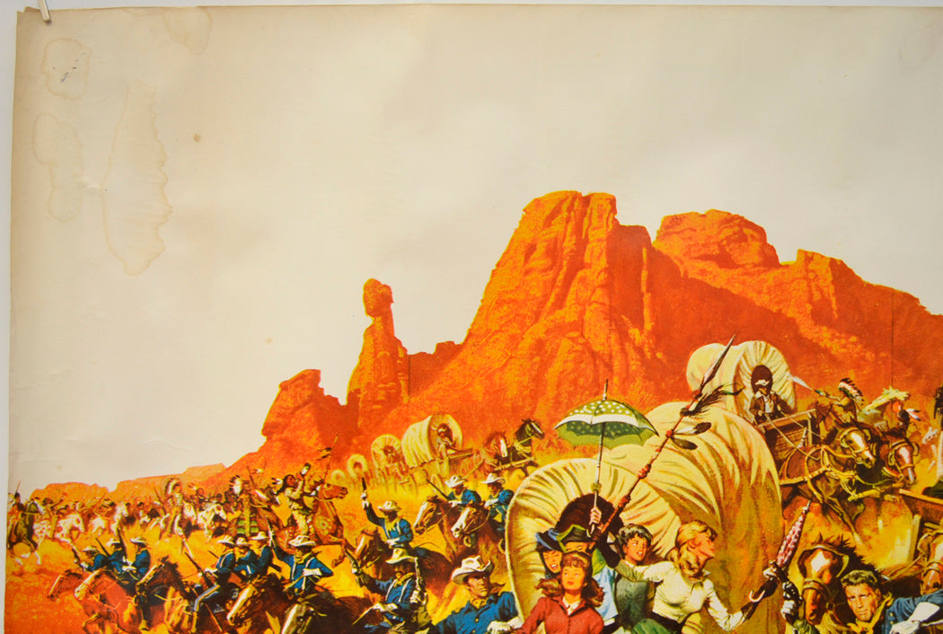 POOR! - Four large light Brown liquid stains and a couple of smaller stains around the top left corner area (largest stain is 11 x 4 cm), whole poster has browned slightly, the first 4 inches (11 cm) of the right of the poster has discoloured and has numerous Brown speckles/patches of damp throughout, 4 x 2 cm light Brown liquid stain near the top right corner, darker Browning to the tip of the top edge, tiny piece torn from the top left corner, very mild creasing around the edges, surface creasing around both side edges, a few small Brown spots of damp in the white background above the mountains, some very light water stain ridges above the mountains (mostly on the left), approximately 15 light vertical creases evenly spaced across the top of the poster (longest is about 9 cm), 2 cm jagged pinhole tear near the top right corner, 2 cm pinhole tear near the top left corner with 2 additional surrounding pinholes, three pinholes near the bottom left corner (have torn together), 2 cm pinhole tear near the bottom right corner, 12 cm vertical fine green print error line just above Lancaster’s head going up to the top of the mountains, 15 cm fine vertical green print error line through the Indian with the bottle who is leaning the back on the horse to the right of Lancaster, main artwork is actually very good.