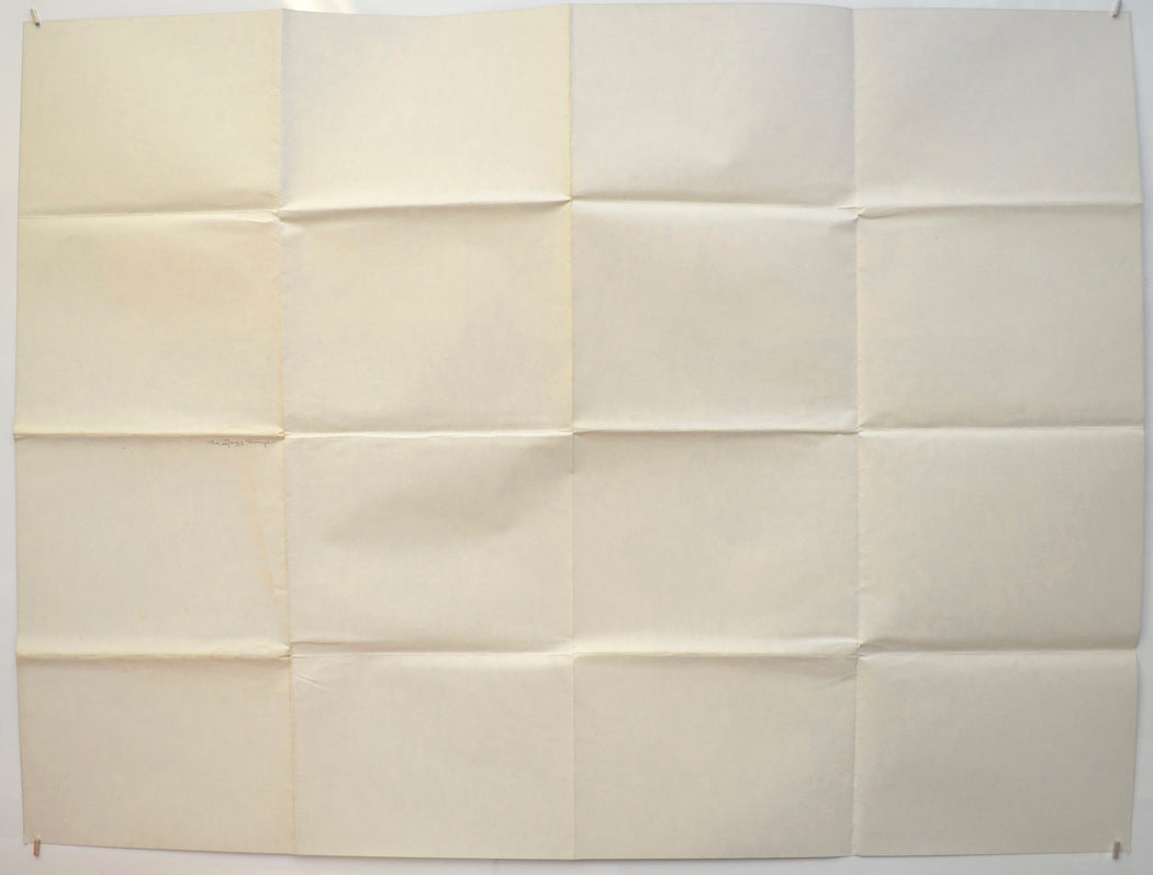 Two extremely tiny tears on the right edge, very light creasing around some of the fold intersections (note there are three horizontal and three vertical folds as issued), very faint 7 x 2 cm water stain on the back of the center and bottom fold intersections of the right vertical fold and the title has been written on the back here also (only noticeable on the front if the poster is held up to the light / backlit), otherwise excellent.