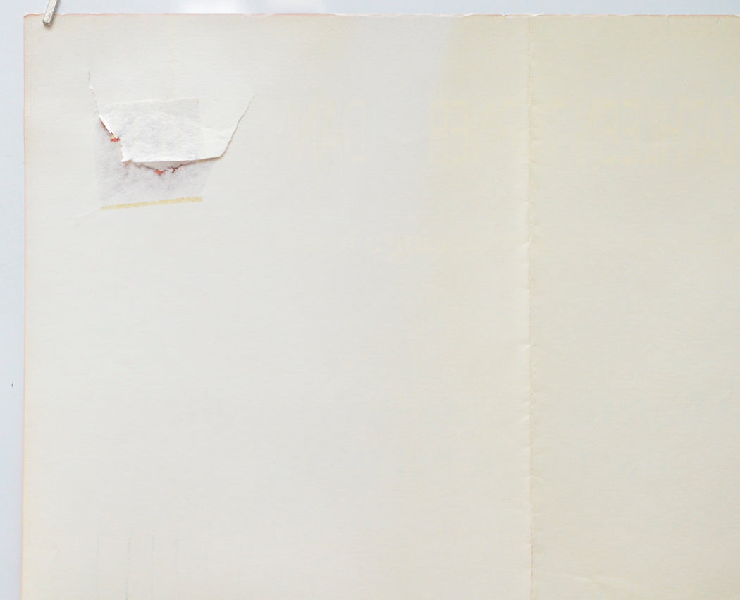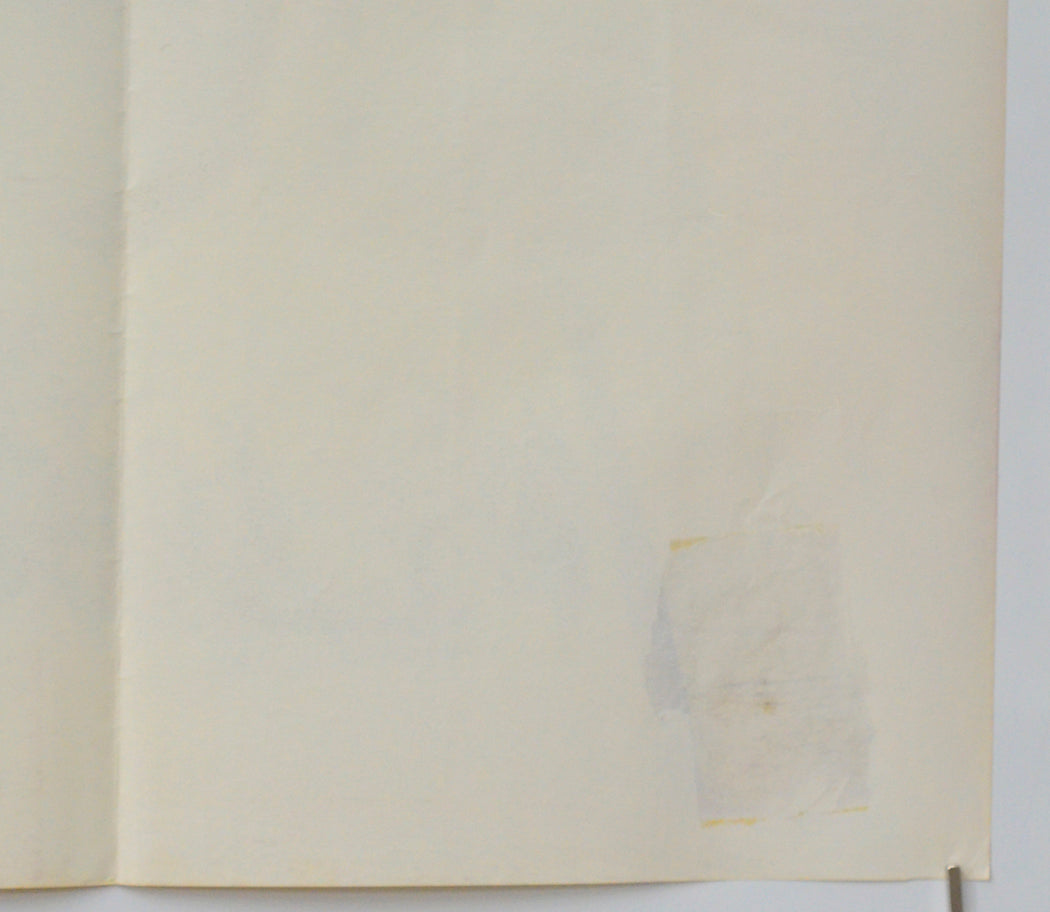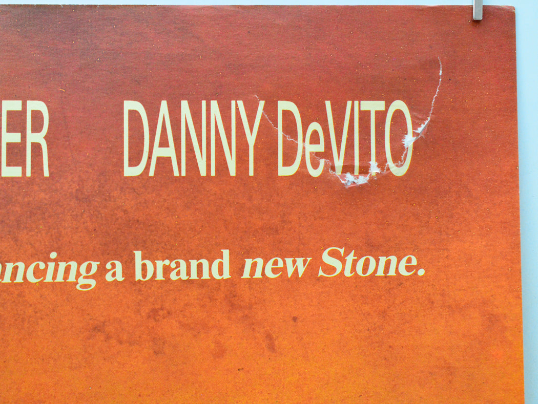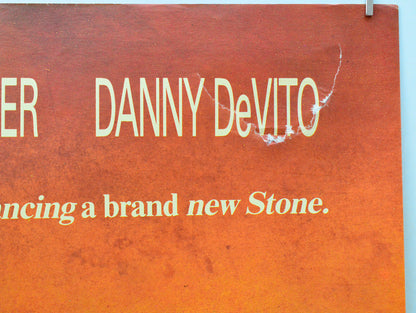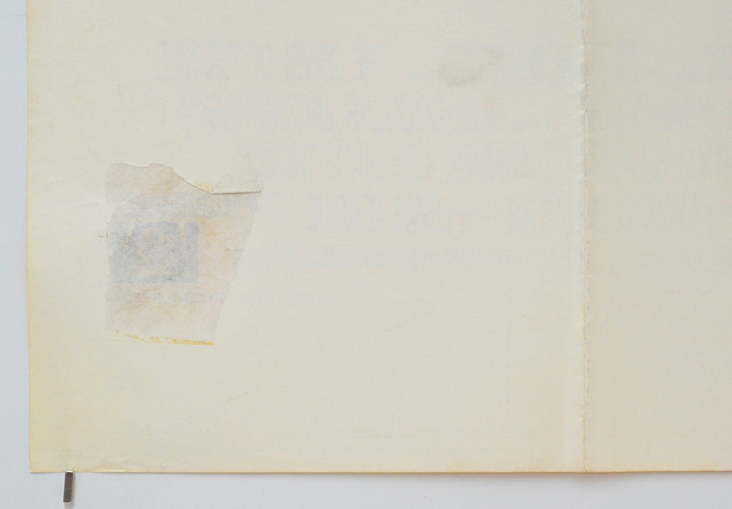 Four 8 x 6 cm (approx.) patches of surface paper loss (due to tape or sticker removal) on the back of every corner area (whilst these have caused paper thining they are only really noticeable on the front if the poster is held to light/backlit but the one near the top right corner has caused a 14 cm semicircular tear through the DEVITO credit where there is also a few tiny spots of print loss), approximately 5 tiny tears on the top edge, two tiny tears on the bottom edge, extremely tiny tear near the top of the left edge, tiny shiny dot in the blue sky to the left of Douglas’s elbow, extremely mild fold wear (stress marks on some the fold lines and creasing around the center vertical fold line and the intersections), otherwise very good.Double Sided :
