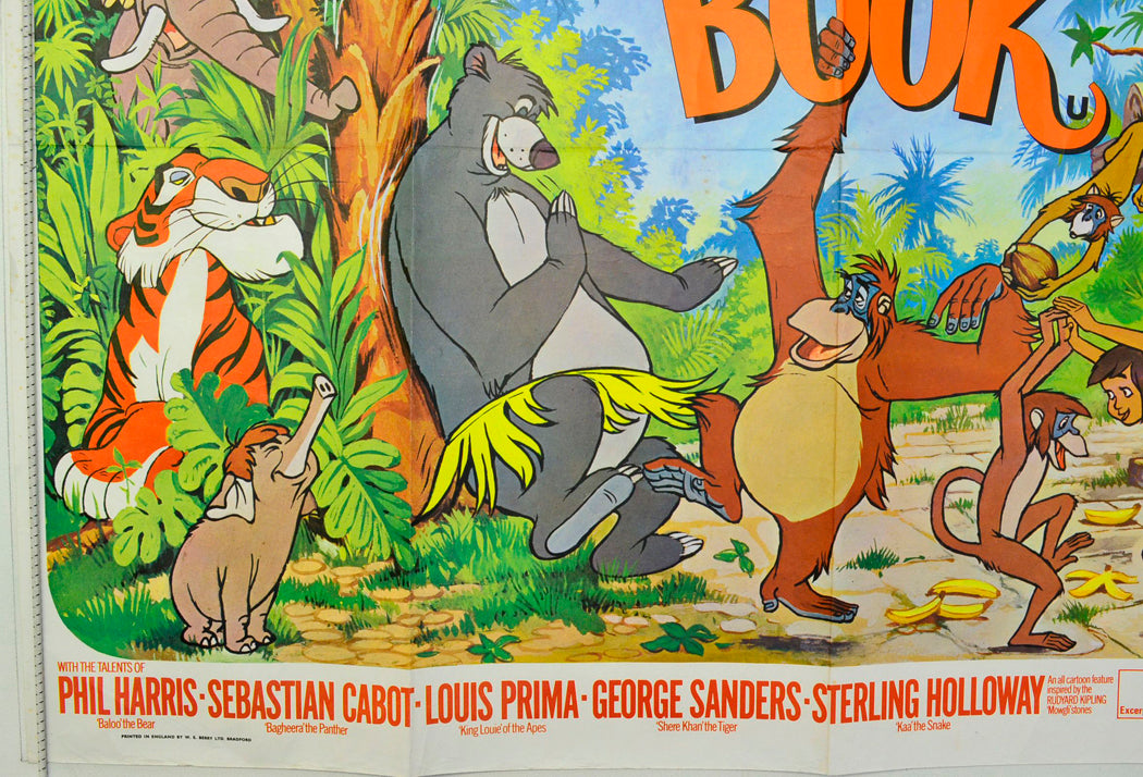 Numerous small brownish spots of damp throughout the white borders on the left and right edges (unfortunately the bars I use to hold the posters in place do obscure some of the spots in the photographs I have taken) there are also a couple of spots within the top and bottom borders, 1cm edge tear and a couple of tiny edge tears on the top edge, three fine blue diagonal print error streaks near the bottom left corner (through Phil Harris credit) and three more near the bottom center and another near the bottom of the right vertical fold line, grubby mark near the bottom right corner (above the “IC” in “TECHNICOLOR”), three tiny brown spots of damp just below the “B” in “BOOK” and another three within the “N” in JUNGLE” plus a couple of ransom spots (all barely noticeable), some light surface creasing, Otherwise Very Good.!