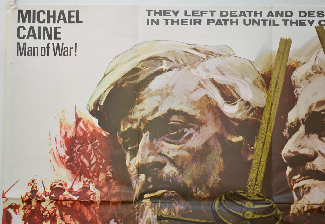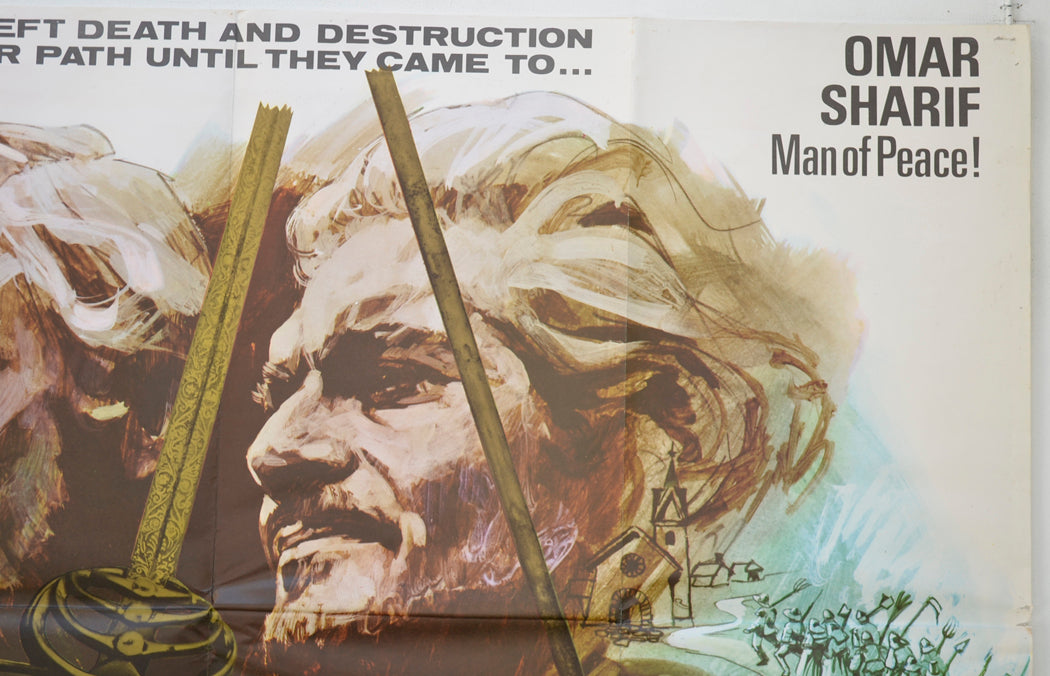 A couple of extremely tiny tears and moderate creasing on the top edge, 2 cm jagged pinhole tear through the top left corner, 1 cm piece torn from the center of the left edge, 2 cm tear also on the left edge, 2 cm pinhole tear through the bottom right corner, three extremely tiny tears and mild creasing on the bottom edge, two 1 cm pinhole tears through the center of the right edge, six pinholes near the top left corner (some have torn), four pinholes near the top right corner (all have torn), approximately twelve additional pinholes along the top edge, approximately 13 pinholes above Michael Caine’s head and six above Sharif’s head, pinhole on Sharif’s eyebrow, eight pinholes near the center of the left edge, four pinholes near the center of the right edge, two pinholes in the red background to the right of the Samurai on the right, approximate twelve pinholes near the bottom right corner (some have torn), approximately twelve pinholes around the bottom left corner section (some have torn), six additional pinholes along the bottom, very mild fold wear, some white speckles within the red background above the Samurai on the right, very slight Browning around the edges, title written on the back in Biro, main artwork is very good.
