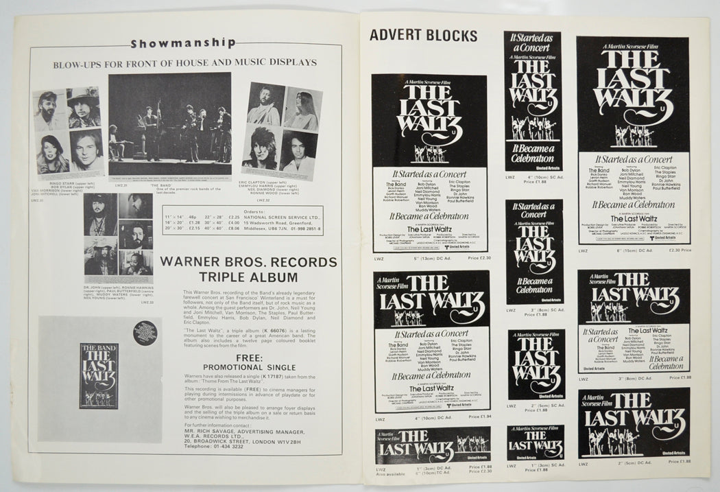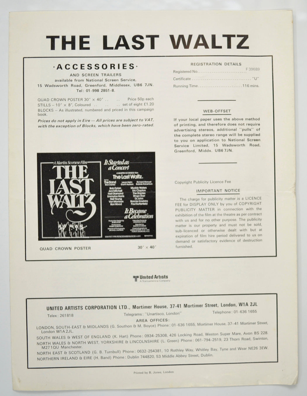 “The Last Waltz” Original 6 Page Cinema Exhibitors Campaign Pressbook (UK)
