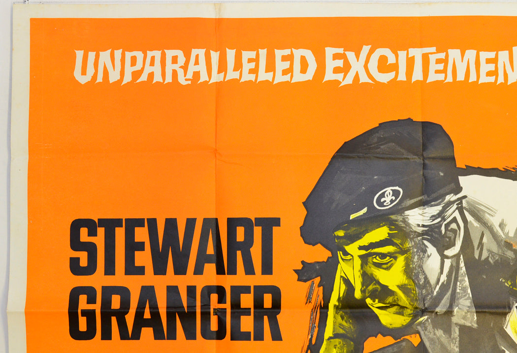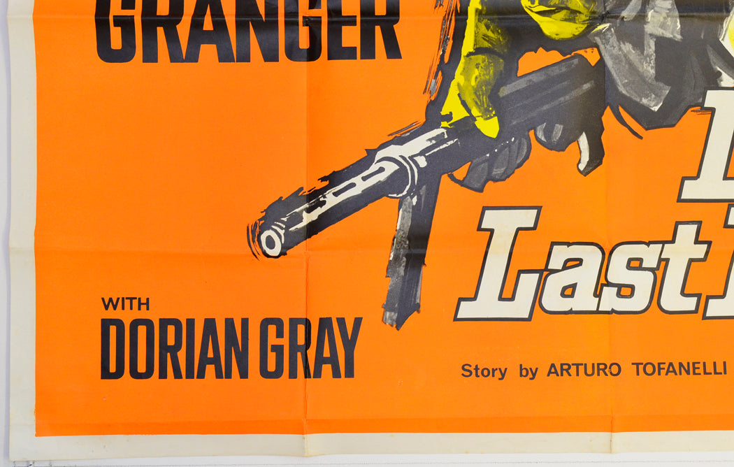 Additional horizontal fold line near both the top and bottom edges, two 1 cm tears on the bottom edge, extremely tiny tear on the right edge, light Browning along the tip of the top edge, a couple of tiny Brown spots of damp within the outer white border, Browning/spots of damp on the back of the left vertical fold line and the back of the left half of the center and bottom horizontal fold lines along with some additional patches within the surrounding areas (only noticeable on the front if the poster is held up to the light / backlit), two small brown stains also on the back of the poster (these are very faintly visible on the front… more so if held to light) just below the second “G” in “GRANGER”, band of patchy dark print speckles between the center of the top edge and the man’s beret plus a few additional patches around the top left corner of the orange background, very mild fold wear including a small wear hole at the bottom fold intersection on the left vertical fold line, 2-7 pinholes near each corner, 4 pinholes near the top center, 2 pinholes near the bottom center, 5 pinholes in the man’s beret and another just above it, pinhole near the left edge (just above center), two numbers written on the back in Biro (only noticeable on the front if the poster is held up to the light / backlit), Otherwise Very Good.