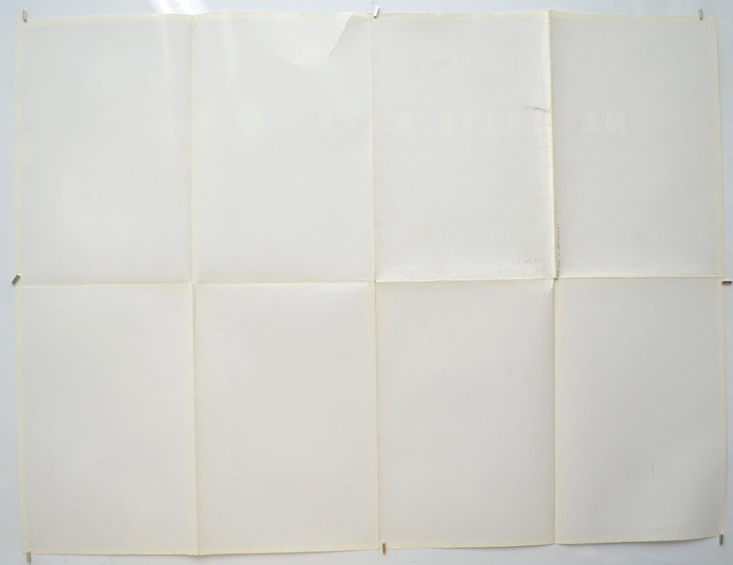 7 cm tear from just right of the center of the top edge downwards, tiny piece torn from the tip of the top left corner, two 1 cm tears on the right edge, tiny piece torn from the tip of the center of the bottom edge, extremely mild creasing on the bottom edge, some light surface creasing near the bottom edge including several small white stress marks, small spot of blu-tac grease/residue below the A in the MARGOLIN credit and another at the same level but further right, fold wear including a tiny wear hole at each the three intersections plus thick white stress marks on all fold lines, 2 to 3 pinholes near every corner and the center of every edge, the title has been written on the back in blue Biro and the back of the top half of the left vertical fold line and the back of the left half of the center horizontal fold line have brown/have Brown spots of damp on them (only noticeable on the front if the poster is held up to the light / backlit), some additional faint dull patches of damp on the back of the top left corner fold segment (not noticeable on the front), some light patches in the black background near the top of the left corner, otherwise okay.