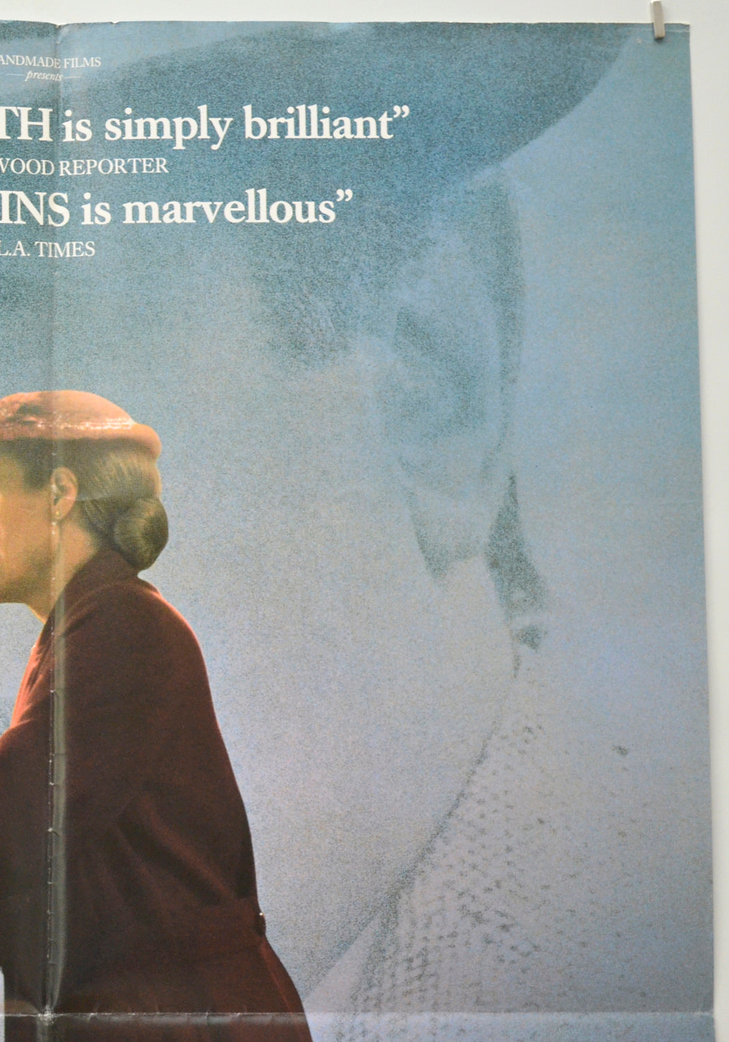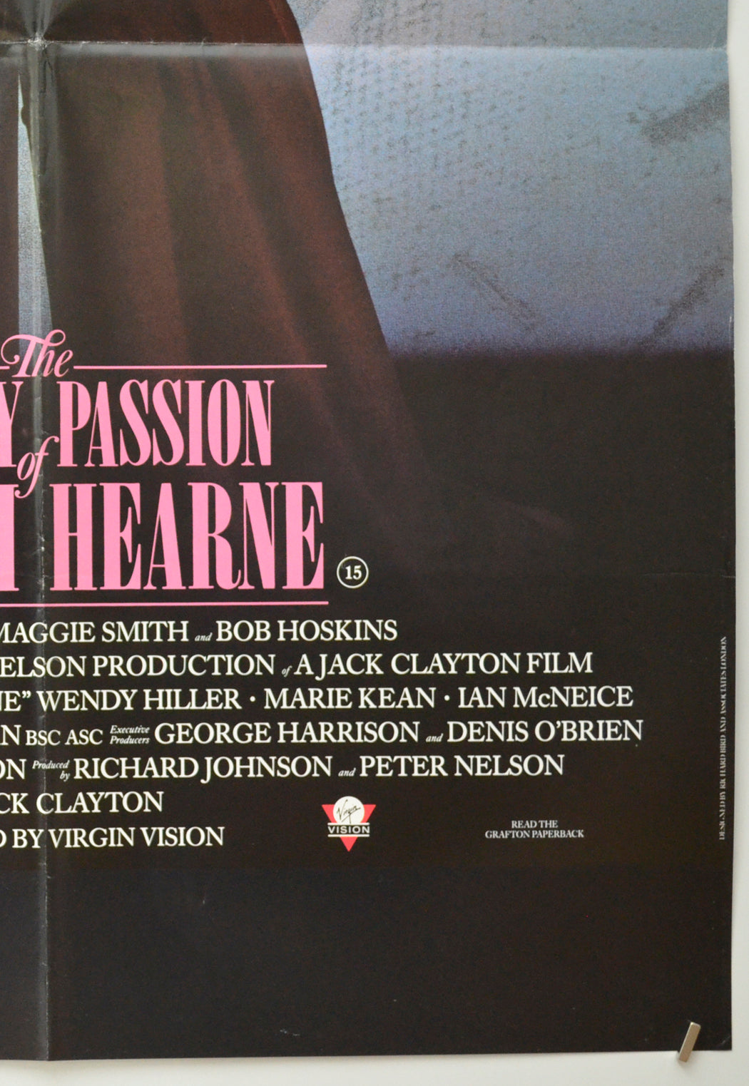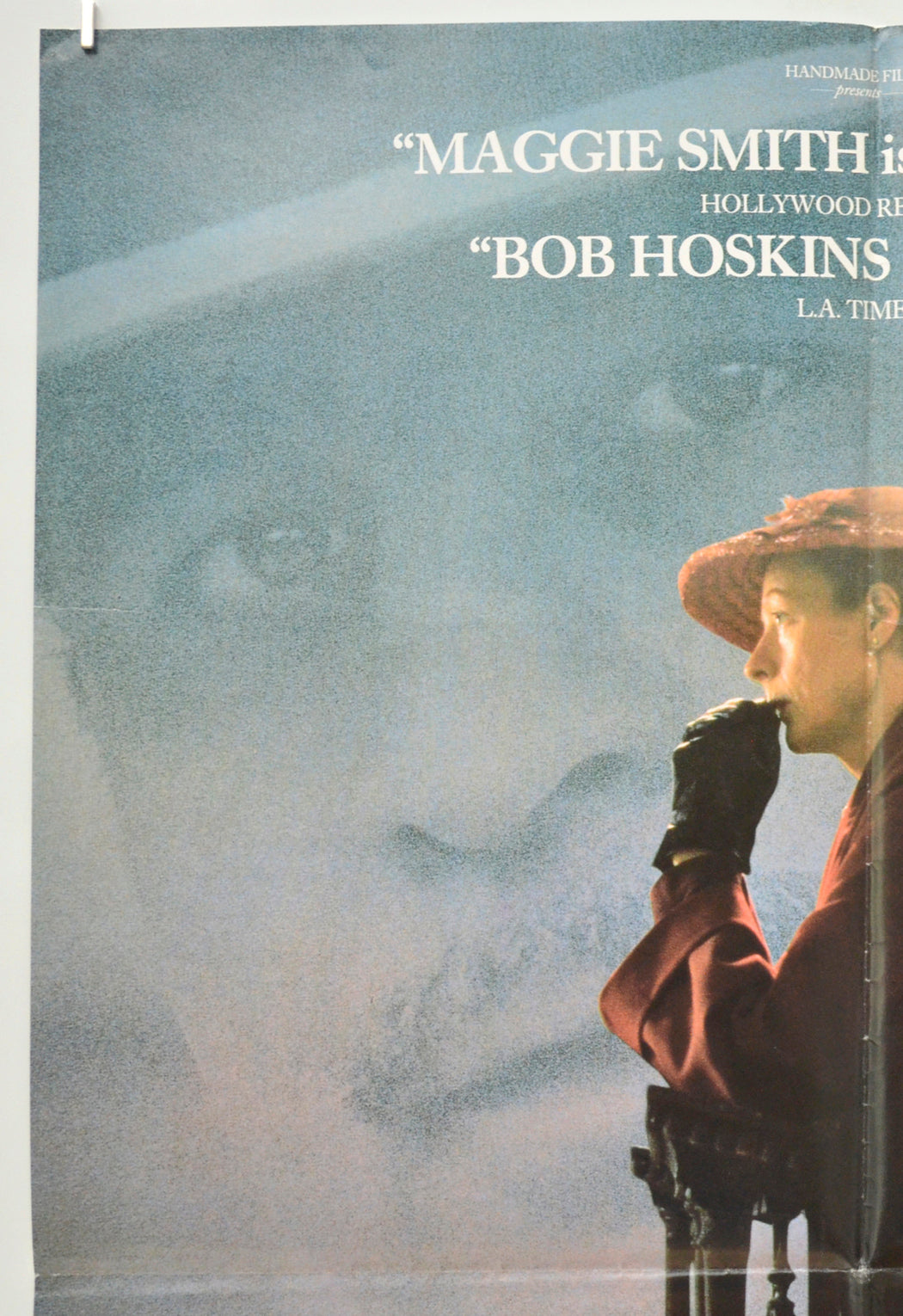 Tiny tear and extremely mild edge wear on the top edge, 3 cm horizontal crease across the top right corner, tiny crease across the tips of the other corners, extremely mild creasing on the right edge, two additional faint horizontal fold lines across the poster (one going across Maggie Smith’s eye level and the other across the bottom of the title text), mild fold wear (white stress marks on the fold lines), tiny pinhole near both top corners, the title has been written on the back in black Biro and there are a few tiny faint Brown specks of damp (foxing) on the back of the top half of the center vertical fold line (only noticeable on the front if the poster is held up to the light / backlit), otherwise very good.