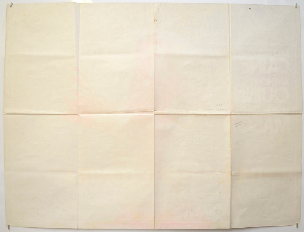 The poster may have become slightly damp at some point as some of the red print has bled through to the back of the poster (most noticeably around the bottom center) this has not caused any staining on the front but the surface is lightly wrinkled/creased throughout. Tiny tear and extremely mild edge wear on the right edge, two tiny tears and extremely mild creasing on the bottom edge, a couple of tiny creases on the top and left edges, additional creasing around the fold lines due to being folded out of alignment and refolded, extremely mild fold wear including a tiny wear hole at the left fold intersection on the center horizontal fold line plus additional creasing around and between some of the fold intersections, additional creasing around the top center, approximately 6 pinholes near every corner and the center of the top edge (some are a few inches inward of the edges and a few have torn), two pinholes in the black background below the car, 1 cm tear just below the top fold intersection on the right vertical fold line, a few tiny brownish speckles of damp on the back of the bottom of the poster (not noticeable on the front), otherwise good.