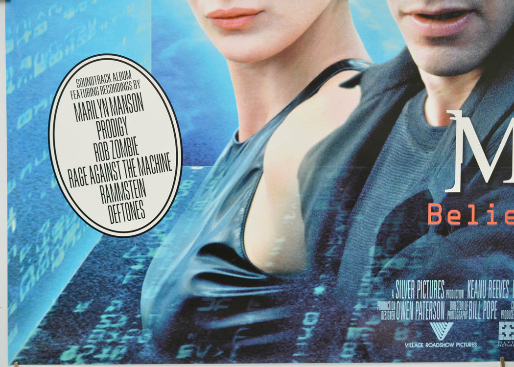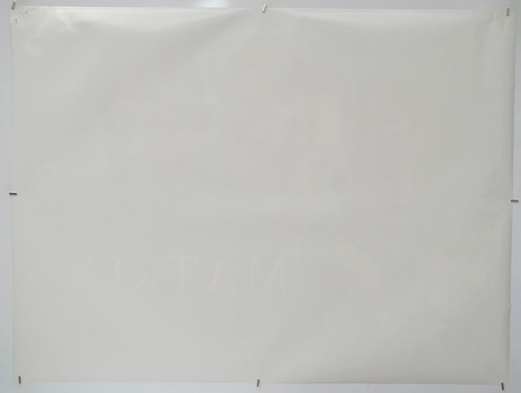 5 x 5 cm area on the back of the top right corner appears to have become slightly damp at some point creating a dark watermark? and a 1 cm patch of surface paper loss/lift on the back (all only noticeable on the front if the poster is held up to the light / backlit), very light surface creasing around the top corners, tiny tear on the bottom edge (right of center), light horizontal 3 cm crease through the tip of Reeves’s nose, light 2 cm crease within Moss’ right cheek, approximately five tiny light surface creases below the soundtrack oval on the left, otherwise excellent!