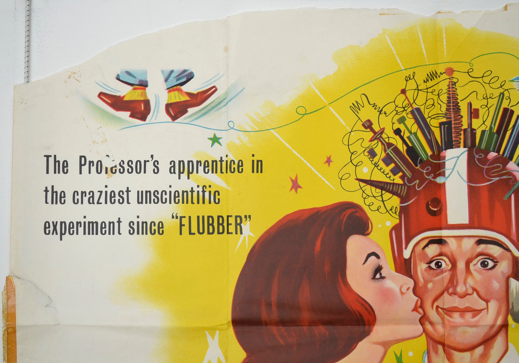 BAD! - 60 cm long piece torn from the top edge (from just right of center tearing completely across the top left corner… taking 11 cm from the top of the left edge at the deepest point), 7 x 5 cm piece torn from the top right corner with a few tears emanating from it and a little surface paper loss and tape adhesive staining in the surrounding areas, 5 x 6 cm piece torn from the bottom right corner (with a little surrounding tape adhesive staining and surface paper loss), tiny piece torn from the bottom of the left edge, 4 x 4 cm area of surface paper loss on the bottom left corner, 9 cm semicircular tear from just above the center of the left edge down to the center horizontal fold line (there maybe a few spots of paper loss and there is also some surface paper loss from the surrounding areas), 11 cm strip of Sellotape at the center of the left edge (has stained the paper needs beneath), 11 cm patch of tape adhesive staining and surface paper loss just above the center of the right edge, 13 x 2 cm diagonal strip of tape adhesive staining and some surface paper loss from just inward of the remainder of the top left corner area down to the “fe” in the “professor” text, 1 cm tear also on the left edge, 16 cm and a 9 cm strip of tape adhesive staining on the top edge, 2 x 2 cm patch of tape adhesive staining with some surface paper loss in the white background a few inches inward of the top right corner, 3 cm tear on the right edge, 2 to 5 pinholes near every corner, very mild fold wear, small faint Brown spots of damp near the top of the left vertical fold line, small Brown’s patch of damp on the center of the bottom edge with a little tape adhesive staining above it, several grubby marks around the top right corner area, title written on the back several times in Biro (only noticeable on the front if the poster is held up to the light / backlit), main artwork and title area are still very good.