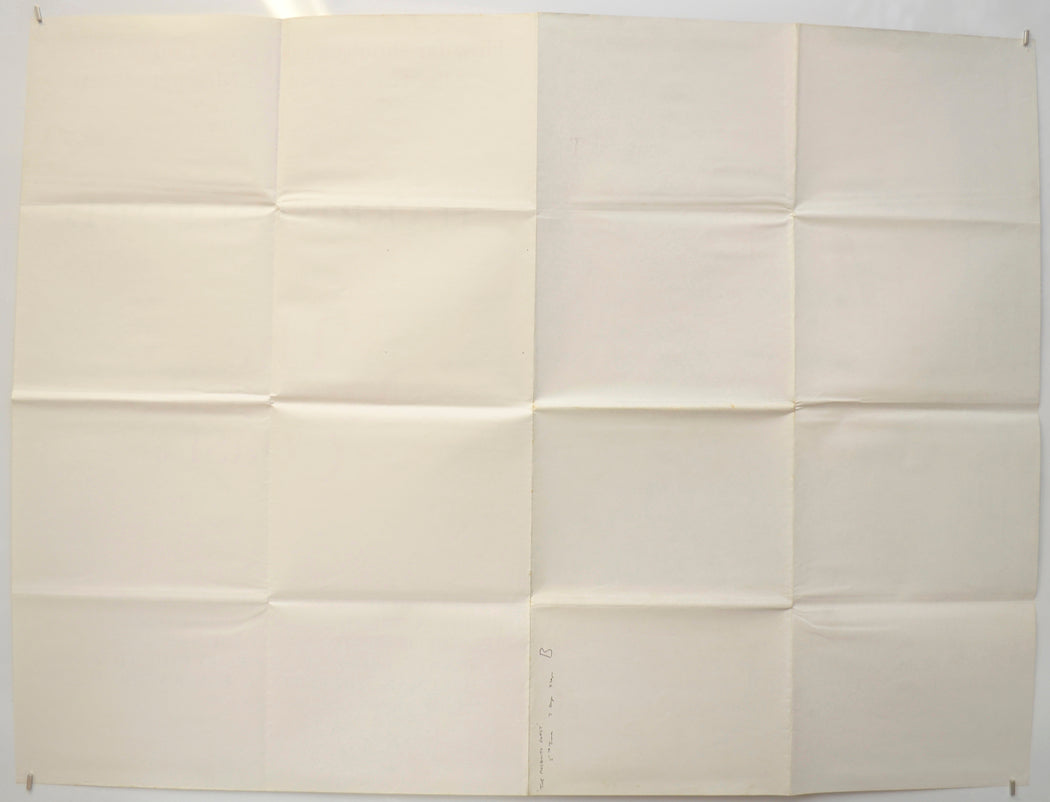 Two tiny tears and very mild creasing on the bottom edge, a couple of tiny creases on the top edge, and two pinholes near the top left corner and one near the top right corner, four pinholes in the cream background just above the center of the poster (in a square formation) some have light ring impressions from the original drawing pins, light creasing around some of the fold intersections (note there are three horizontal and three vertical folds as issued), additional creasing around a couple of fold lines due to being folded slightly out of alignment and refolded, title written on the back in Biro (only noticeable on the front if the poster is held up to the light / backlit), otherwise very good.