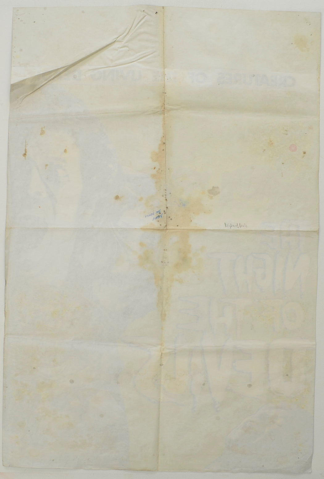 POOR! – Large brown liquid staining throughout the back of the poster (heavier through the central area) The staining has lightly bled through to the front in places including on woman’s forehead and within some of the white lettering of the title, plus it has also creased the surface, heavy creasing across the top right corner fold segment, small tear at the top center, two small tears and mild creasing on the right edge, 2 to 3 pinholes near every corner and the center of the top edge, very mild fold wear (note there are three horizontal fold lines), otherwise okay.