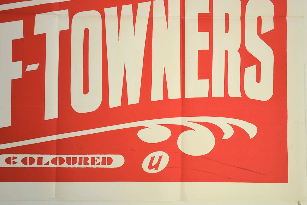 2 x 1 cm piece torn from near the bottom left corner, two tiny pieces torn from near the top of the left edge (these have a connecting tear), strip of tape near both top corners (the adhesive has stained the paper beneath), tiny tear and mild creasing on the left edge, 1 to 2 creases across each corner, a couple of grubby marks in the side borders, pinhole near each corner, the title has been written on the back in purple felt pen which is visible on the front (in top border near right corner), two long dark streaks in the red background (bottom right) plus a couple of smaller streaks also within the bottom of the red background (probably a print error), cheaply produced poster (the edges of the text are not particularly sharp), Otherwise Very Good.