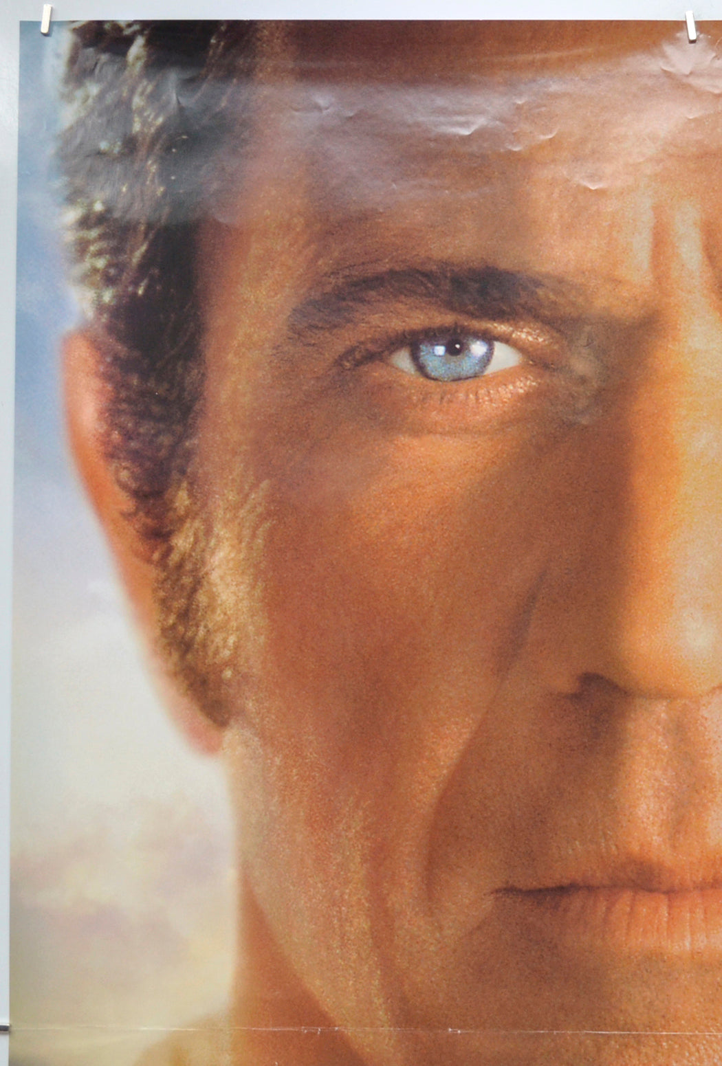 Horizontal crease completely across the center of the poster (has white stress marks on it), 3 cm diagonal light surface crease and a smaller crease near the top right corner, approximately four tiny white surface creases just above the bottom edge, very light 12 cm diagonal crease across the bottom right corner, otherwise good.
