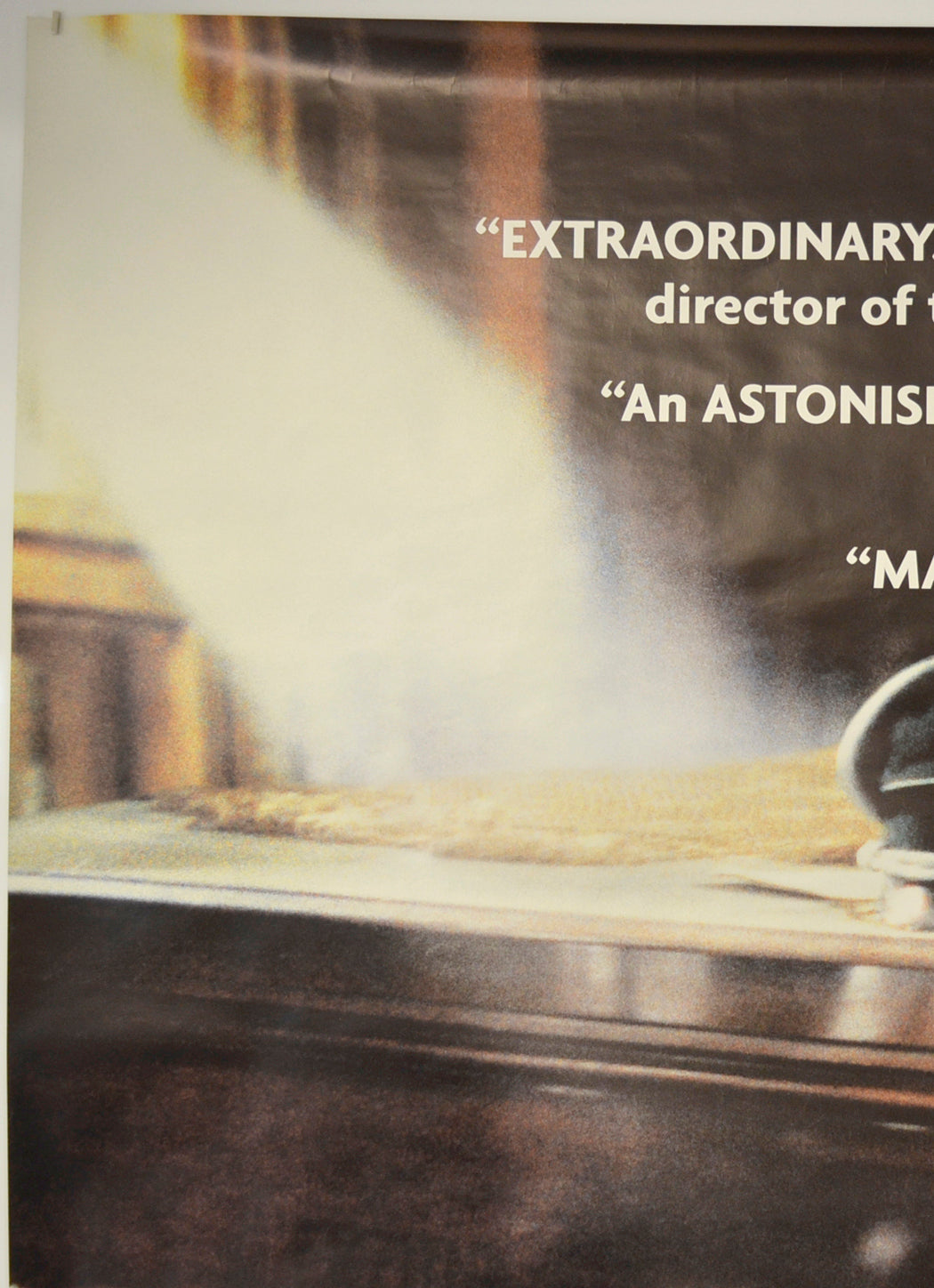 Very mild creasing on the left edge, 30 cm band of tiny horizontal light brownish print error lines near the right edge (right of the end of the title), some light surface creasing throughout the poster, small rubber band mark on the back of the poster (not noticeable on the front), otherwise very good.